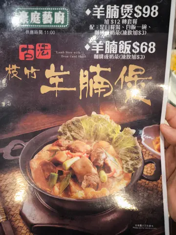 天氣無啦啦又轉返做廿零度,凍凍地見到呢一個餐牌即刻心動,於是就行動叫咗個98蚊羊腩煲,再加埋12蚊轉套餐,有埋一個例湯一碗白飯同埋一杯餐飲,都算抵食。羊腩煲有冬筍同埋冬菇,少少哋一兩舊咁啦,不過有大量支竹,索曬啲羊腩汁係好正嘅,仲有一碟腐乳。羊腩嘅件數都算合理,而且炆得夠淋夠入味,脂肪部分比較少,以呢一個價錢嚟講性價比算高。例湯都ok,咁嘅狀況算有誠意啦。白飯都夠大碗,凍奶茶少甜少冰加三蚊,滿足的一個晚餐。