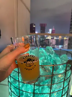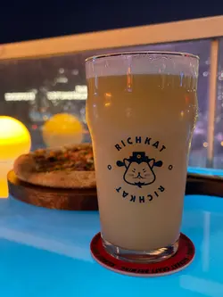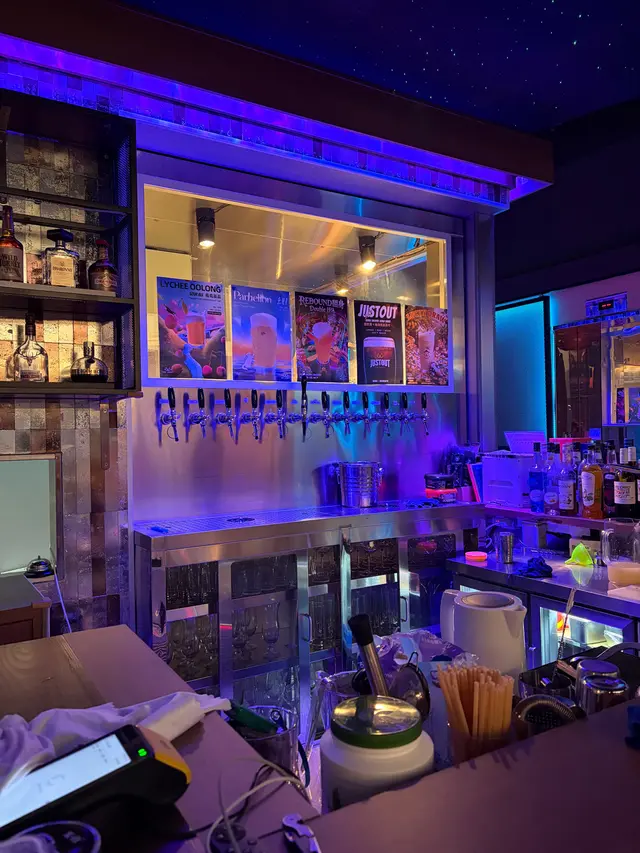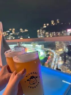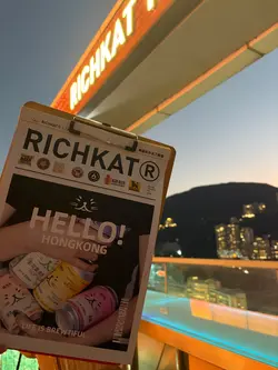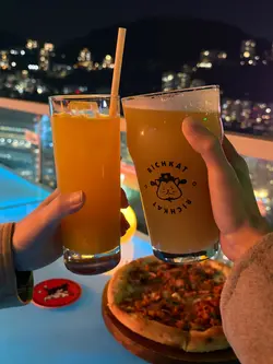RICHKAT ROOFTOP 貓員外楼高空露台直接封神,对着港岛璀璨夜景碰杯,晚风里都是甜丝丝的微醺感!🇭🇰高空夜景30 楼顶楼视野绝了!玻璃吧台位能直接俯瞰铜锣湾闪闪发亮的夜景,灯光像星星落进城市里✨室内星空顶氛围感拉满,暗调灯光 + 温柔音乐,也太甜了~🍻微醺猫员外手工精酿真的可!点了 6 杯品鉴 set,度数都不高,从浅黄到深棕依次喝,口感层次超丰富~强推【花魁】果香超浓郁,入口回甘;【桃宝】带着淡淡的水蜜桃香,女生一定爱!性价比拉满~8 点前还有 happy hour,性价比直接拉满,人均 150 + 就能喝到精酿 + 吃小吃,还没有加一费,学生党也无压力!🍕下酒小吃本来以为只是喝酒的地方,小吃居然意外好吃!✅爆炸薯仔:外脆里糯,撒上辣椒粉超香,配啤酒绝了✅披萨:饼底薄脆,肉嫩到爆汁,芝士拉丝超满足分量很足,两个人点两份小吃 + 一套酒完全够吃~