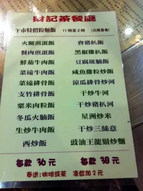 財記 happyduckling等級42013-04-11207 瀏覽 關注 原本開在砵蘭街地鋪的「財記」,午餐有時都會去;碟頭飯大大碟,款式多,價錢平,但十分擠迫而且經常有馬伕坐在門口,十分不便;光顧了幾次就再沒有去。男同事都叫女同事晚餐不要去,因男同事曾OT後去食,入夜後品流複雜,好多男女坐住等「開工」。上年中「財記」突然在砵蘭街消失,年底竟然發現搬了上朗晴坊4樓;改頭換面,沒有了昔日的「黃色」味道。從良後的「財記」,現在已成為我經常光顧的午飯飯堂。地方比以前大而且光鮮,而且有一個大露台放了不少枱放便食煙客人在外面用膳。午市經常人山人海,食完慢慢飲嘢,服務員會叫客人快走,真係無服務;枱與枱之間係零距離,十分迫,經常會給服務員及人客撞。午市炒粉麵飯餐同舊鋪差不多,同樣款式多及大大碟,所有粉麵飯有中湯或西湯及飲品;價錢劃一$36。每款味道都唔錯,夠鑊氣。 因粉麵飯太大碟,最近轉食麵餐$27 單併 /$29 雙併我通常叫午餐肉出前一丁因出前一丁不用加錢,而且午餐肉份量多唔係好似紙咁薄。如果有些肚餓會叫$31個餐,有火腿奄列+多士(烘底加$1)這裡的熱奶茶好飲,用黑白奶冲,茶香奶滑,正!…查看更多+ 6以上食評乃用戶個人意見 , 並不代表OpenRice之觀點。讚好分享財記 財記茶餐廳 https://s.openrice.com/QrbT0elaY00檢舉 張貼 評分3味道2環境2服務2衛生4抵食用餐途徑堂食人均消費$35 (午餐)