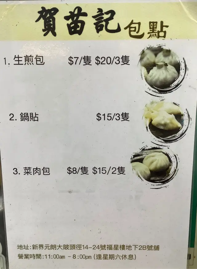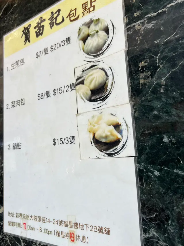 賀苗記包點在元朗都算係幾出名,經常大排長龍,大多數人為既都係招牌生煎包,$20 有 3 個,價格親民,唔少元朗既學生街坊成日幫襯!聽聞一個好味既生煎包,皮薄底脆、汁豐肉鮮缺一不可。賀苗記包點既生煎包絕對稱得上係一個好味既生煎包,皮唔只薄,非常軟熟,而且個個生煎包既底都係煎到金黃香脆,個個生煎包一咬都爆汁夠哂汁豐,生煎包入面既肉餡鮮甜,新鮮出爐,熱辣辣,味道濃郁,口感層次豐富,一個人食 3 個生煎包好似都唔夠!…查看更多