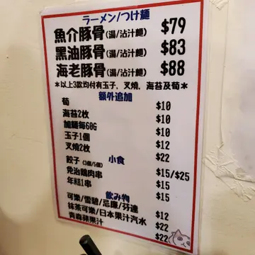 拉麵店可以乘搭輕鐵或西鐵站下車後行10分鐘左右便到。今次食晚餐,晚餐1800才開始。叫左兩個沾麵一個海老$88,一個黑油$83海老嘅櫻花蝦味好濃好香沾麵汁不是很濃很「杰身」那種,比較稀。麵的掛湯能力不過不失,但麵的擺放很快使都變涷同固定左😂 要夾起就要用少少力兩個麵都有幾塊大大塊嘅肉,雖肉質未算稔滑,但卻稱得上「大件夾抵食」店面很好日式風格菜單叫左兩支飲品,但外比較少見的日本果汁汽田和抹茶可樂,日本果汁汽水是桃味的,一般女孩子也會喜歡的味道。小店店面比較少,只有一個待應,我們吃完時間大約1820,外面已有6-7人排隊了。大家想食的話等佢開門就最好,一菜很快👍👍…查看更多