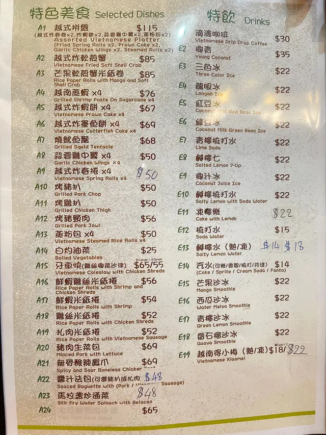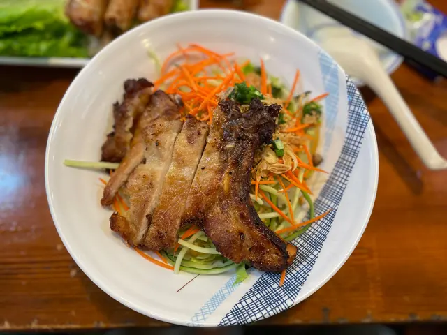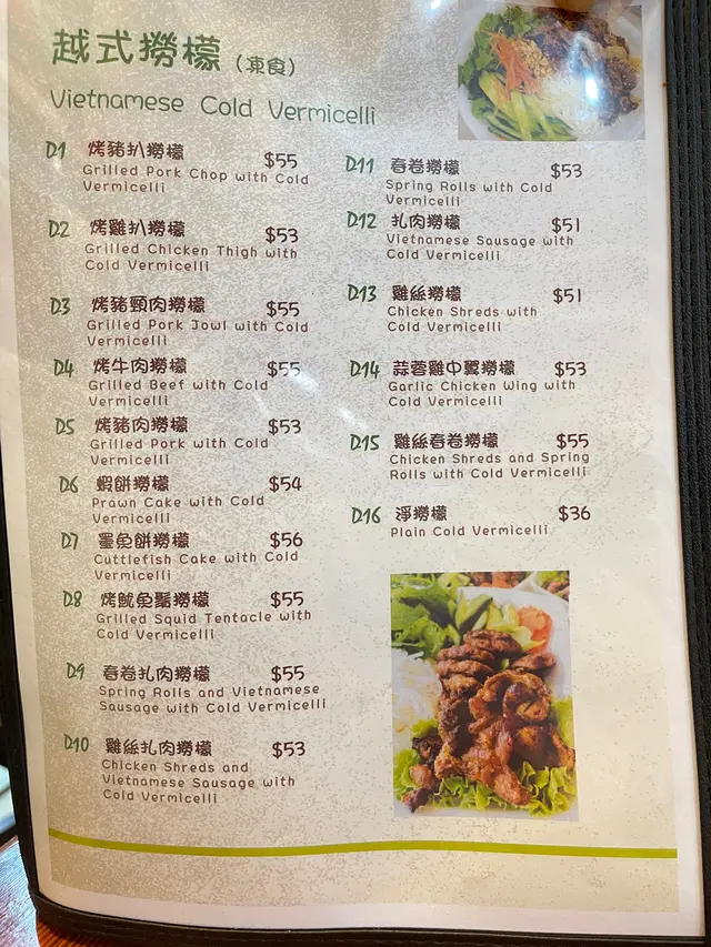 ~烤豬扒撈檬 烤豬扒做得唔錯,入口有淡淡嘅香茅同調味好平衡,豬扒應該係用新鮮貨,撈檬伴菜有生菜絲、青瓜絲、紅蘿蔔絲、炸蔥蒜同蔥油,入口清爽好舒服。~鷄絲扎肉湯河粉先呷一口湯頭,牛骨清湯夠清爽同滋潤,配合生洋蔥同金不換香草滋味更上一層樓。要挑剔的話缺小了”鵝蒂”。。。~越式炸春卷合格~馬拉盞炒通菜油份同鑊氣都夠,問題係馬拉盞未夠惹味,有點點失望。~凍青檸冰合格~越南得小梅第一次飲,有青檸同咸金桔加Soda 水,味道ok綜合係一家用心做的小店,用料足,味道雖然未必可以做到百份百越南真味,不過個人覺得已經有90 分以上,支持!查看更多