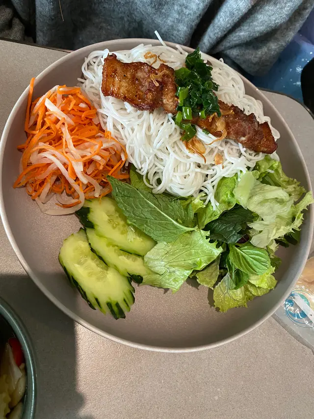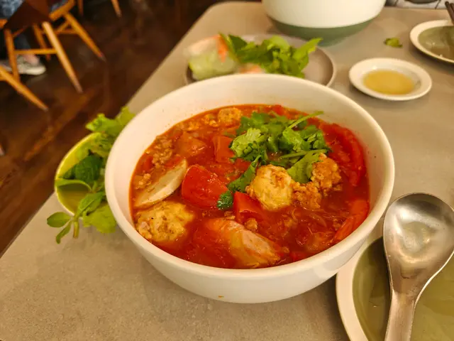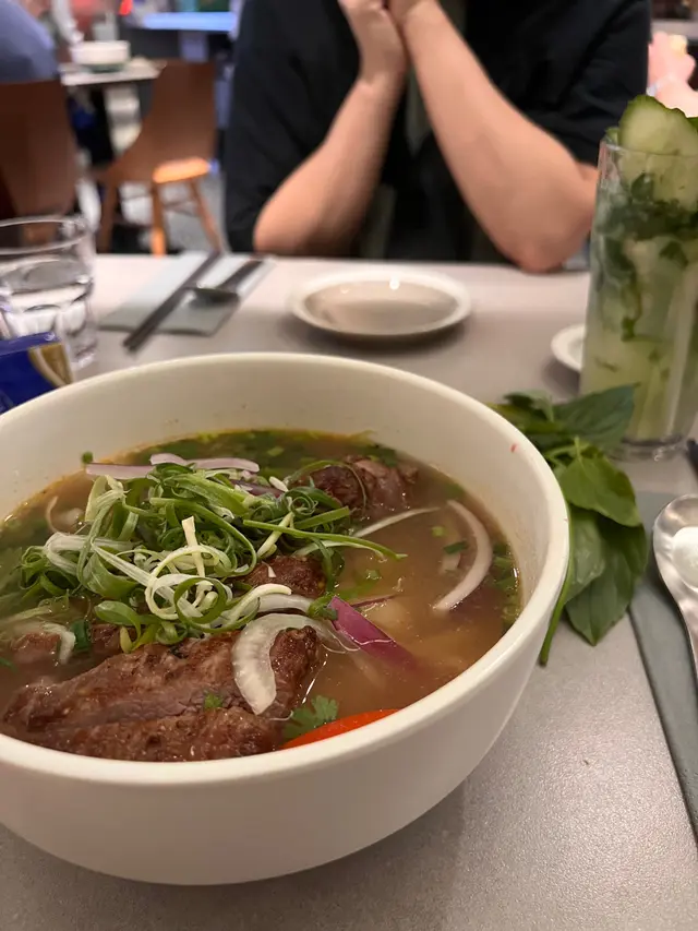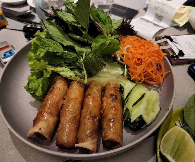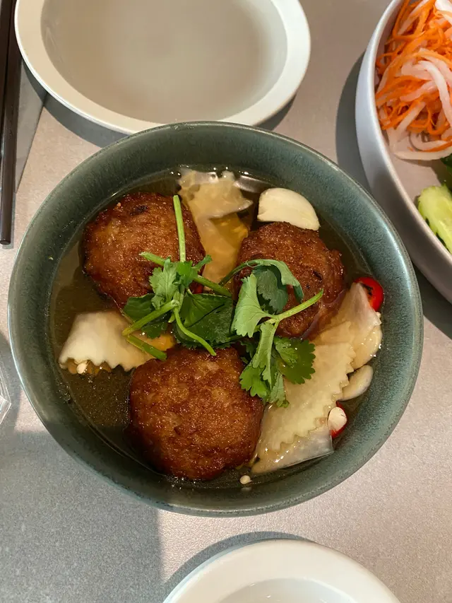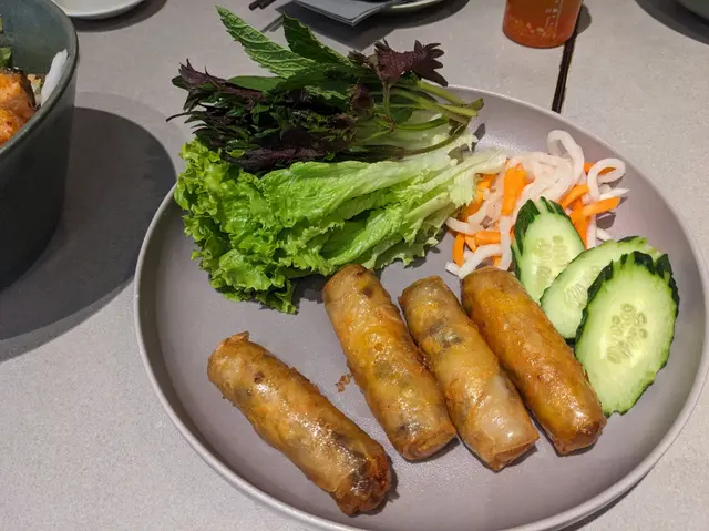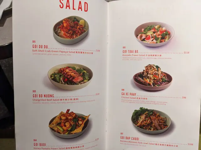小妹幾喜歡食越南菜,今晚晚餐選這家餐廳,第一次來食所以選幾款平常會食的菜式! 香芋蟹肉春卷$98春卷是必食,侍應幫忙將春卷剪開。想不到香芋與蟹肉幾夾,春卷餡料口感飽滿,芋味較濃鹹味適中,炸得香口,生菜也新鮮。桌上配備幾款醬料,先蘸常用的魚露再用生菜包好春卷,好味! 小妹的朋友喜辣,加辣醬食也不錯!烤三文魚撈檬 $108賣相不錯,兩件三文魚扒幾厚,三文魚皮帶點焦香,調味恰當,份量是非常好! 撈檬有蒜片、菜、蔥、蘿蔔絲、青瓜絲等,與魚露一起拌食不錯,我們都喜歡食魚所以很滿足。燒牛肉撈檬 $98牛肉一口大小,有濃濃黑椒味,配菜與烤三文魚撈檬一樣,加魚露再加一點啡色的少甜醬料幾好味。手打牛丸粉$80牛丸也有濃濃黑椒味,丸質爽,湯是清湯,與牛丸的濃味相亙中和。沙嗲牛肉湯粉 $98以為會有濃濃沙嗲在碗面,原來只是有淡淡的沙嗲味,香味不錯,有番茄件及牛肉片,味道比想像中好,有點像沙嗲番茄牛肉湯,飲埋湯都幾飽肚。以價格及份量來計是抵食,烤三文魚撈檬的三文魚份量非常好,沙嗲牛肉湯粉的湯底飲落又暖又開胃,每份菜式都看似一般般但味道質量是不錯!…查看更多
