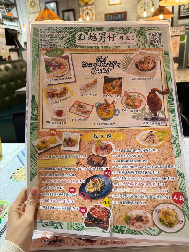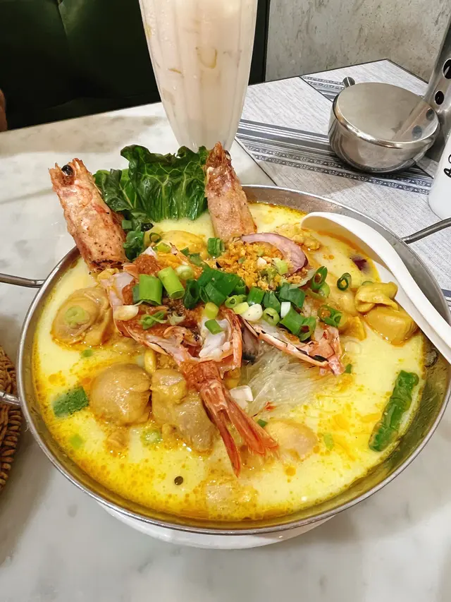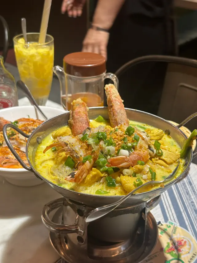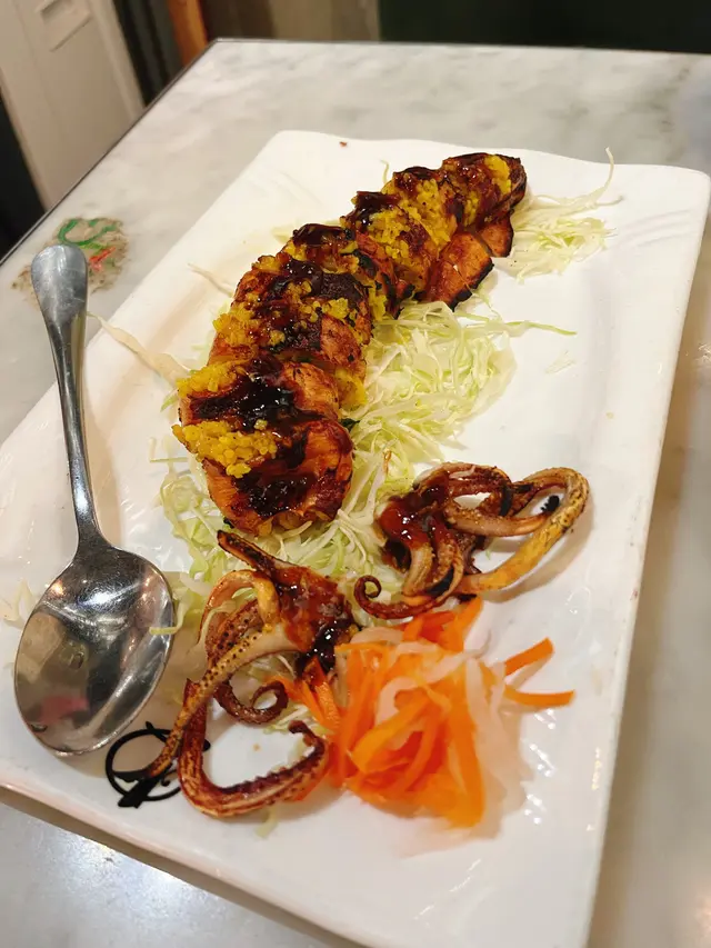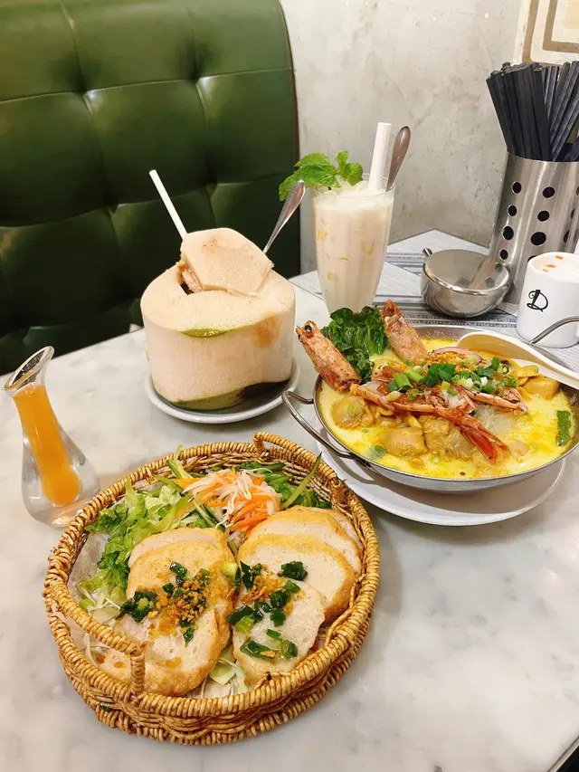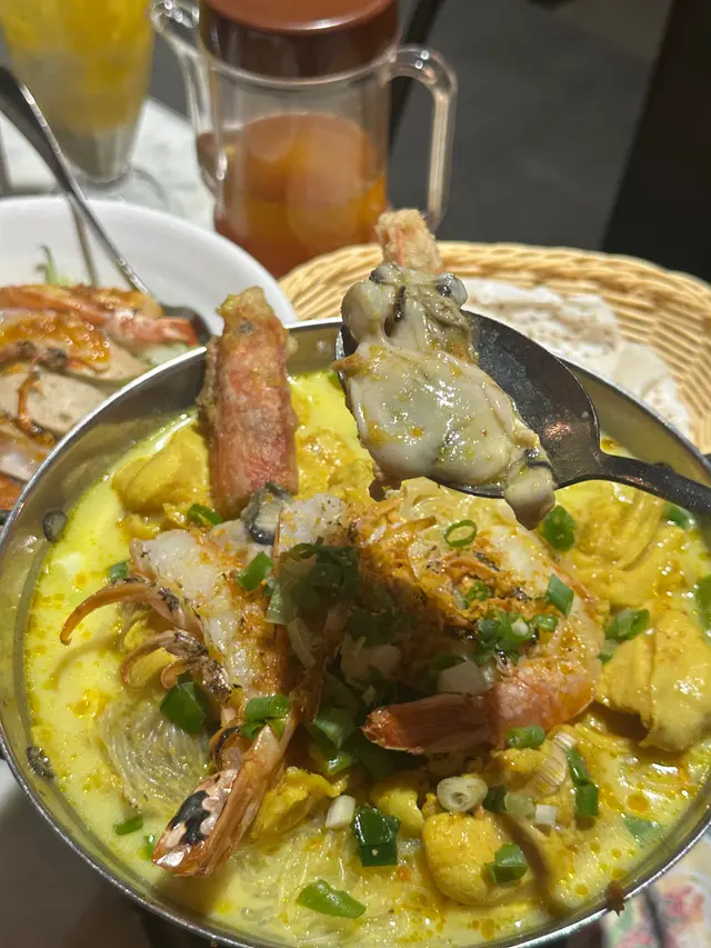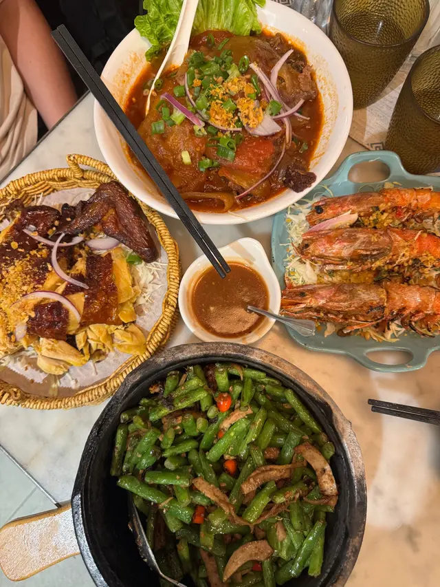 今次的越南菜餐廳一入坐就有佐餐小食蝦片做頭盤,意想不到超幸運。點了河內三鮮椰汁酸湯檬,以蠔、蝦及雞件做組合,湯底椰香酸爽,蝦膏鮮味突出而大大件肉質彈牙,而炸蝦頭香脆得更可直接吃掉,湯汁沾上鬆脆的大脆包,濃濃的湯汁令鮮蝦口感對比更加鮮明。再者蒜蓉牛油雙蝦扎肉撈檬粉香氣撲鼻,蝦肉飽滿,個人覺得有蝦的菜式中蝦隻的烹調處理及用料非常出色,然後當然不能小了撈檬粉的酸香配搭及秘制沙嗲串燒大併盤的精彩,一整條菠蘿擺盤方式非常漂亮,菠蘿與肉串交錯放置,除了視覺吸引外,菠蘿更可當扒自行厚切,啖啖甜汁入口爆開,與烤肉簡直絕配。…查看更多