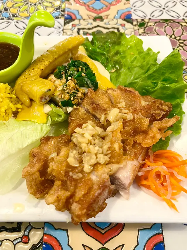 住在屯門的朋友特意來到荃灣找我相聚吃飯,荃灣美食數不勝數,正當我們猶豫之際,一間越南餐廳店員在門外向我們熱情地介紹午餐和下午茶餐。我們點了兩份套餐和一份法式芝心蝦多士。各套餐包有兩份小食和一款飲品。第一份套餐:脆雞炒金邊粉+脆蛋炸魚柳+手撕雞沙律+鮮菠蘿梳打冰放在銀鍋的脆雞炒金邊粉賣相十分吸引。雞塊炸至金黃,濕潤金邊粉酸甜中帶點微辣,還加了扎肉、燈籠椒、紫洋蔥、炸蒜粒等材料,味道很好。魚柳炸至脆卜卜配上有很多蔬菜的手撕雞沙律很適合。👍👏🌷菠蘿梳打冰用上新鮮的菠蘿,並非罐頭菠蘿,朋友表示這杯飲品很好喝,鄰座的食客也喝著這款飲品。果然新鮮食材才能吸引著食客。👍第二份套餐:招牌去骨海南雞配蒜蓉牛油雞扒黃薑飯+手撕雞檬紙卷+無骨黑糖鳳爪沙律+熱香茅薑蜜茶首次吃有椰香味的黃薑飯,比一般黃薑飯更加香和好味。「鴛鴦雞」名稱很適合形容清淡嫩滑雞肉和惹味雞扒,貪心食客能試到兩款口味,去骨海南雞讓食客不用顧慮大口大口吃雞肉。果然是招牌菜,極力推薦。👍😋無骨鳳爪以黑糖醃制而成,非常入味,又方便食客享用,再搭配清爽皮薄的檬紙卷,少許手撕雞肉和多種蔬菜,口感非常豐富。熱香茅薑蜜茶香茅一般用在醃肉上,想不到可用在飲品。清新芳香的香茅配上辛辣的薑片,加了微甜的蜜糖,原來是那麼好喝。不得不提這款飲品有很多功效,如預防感冒、驅風袪濕。極力推薦👍😊法式芝心蝦多士外層灑滿白芝麻,炸得金黃酥脆,裡面搭配了新鮮的蝦仁和流心芝士。口感層次豐富,是一道不錯的美食。用餐期間,店員很貼心,常常提醒用餐後要離開的客人拿回自己的物品。👍👍👏