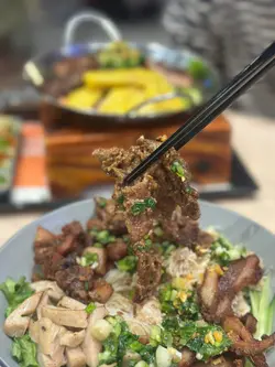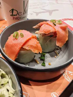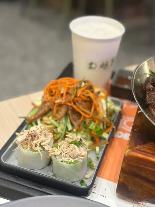 尋晚行開Airside,喺food court見到呢間越南菜,餐牌好似好吸引好多款式,於是試一試。分別叫左兩個套餐,至尊三寶飯(豬頸肉,烤牛肉,海南雞)烤牛肉,好香好惹味👍🏽豬頸肉面脆肉嫩,好香口,海南雞就不過不失。小食就配越南春卷,同煙三文魚檬子卷,春卷皮脆,餡料都好多。另一份餐主食就係生牛+雙蝦椰汁酸湯檬粉,個湯底好重椰香味👍🏽,蝦好大隻,仲有膏😋😋最重要就係佢配埋一兜蒜油,啲蒜油加埋落去個湯度,好香好正👍🏽小食就牛油蒜香雞翼,同墨魚餅。雞翼個炸皮唔太厚,好香牛油同蒜香味。整體而言,food court有咁既質素,性價比超高,值得再去食多次。