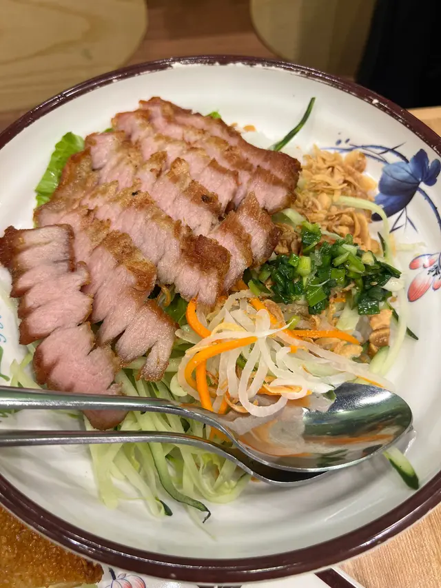 喺openrice隨意搵到呢間餐廳,幾多好評,就嚟試吓,夜晚六點幾嚟到,入面冇乜人食,仲有店員企喺門口叫人入去食,反而對面馬路間越南餐廳就排晒長龍,即刻有少少驚會中伏,但係都照入去試吓。結果係完全冇中伏,食咗一陣七點幾左右都已經好多人排隊。燒豬頸肉湯河雖然睇落個燒豬頸肉好似唔係好燶,有啲白咁,但係其實食落已經燒得好香,好好食,份量都唔少。蝦餅撈檬蝦餅好食,好脆,又香又彈牙炸軟殼蟹反而遜色少少,炸粉比較大舊價錢唔貴,cp值高,兩個人食得好飽,餐牌菜式選擇好多。另外店員服的態度非常好,十分有禮貌,有耐性,好少可油麻地呢啲地鋪仲有咁有禮貌嘅職員,之後人多要我哋2人坐緊嘅4人位讓出一邊,都講咗幾次唔好意思。