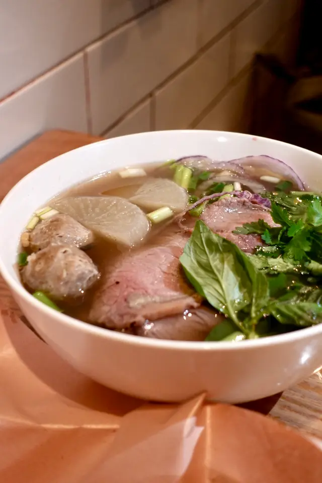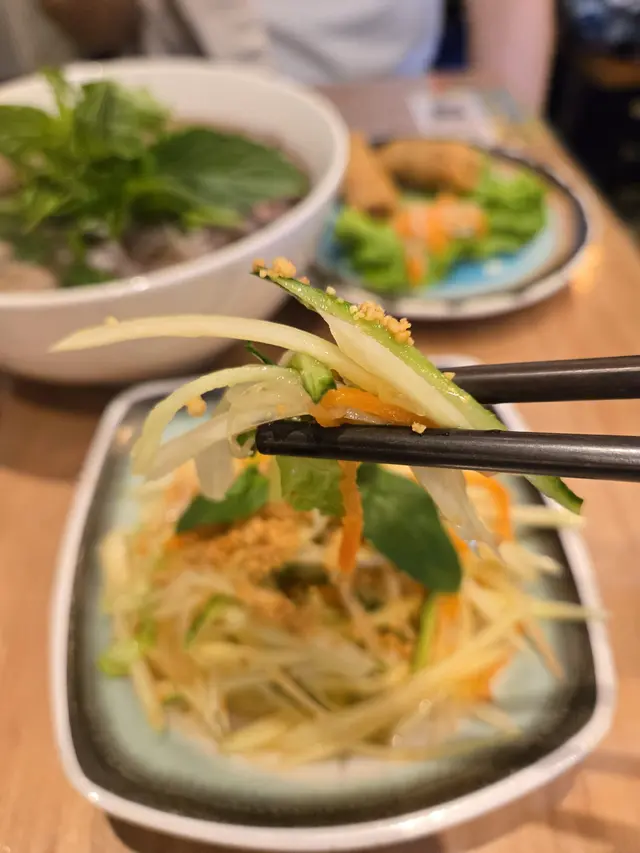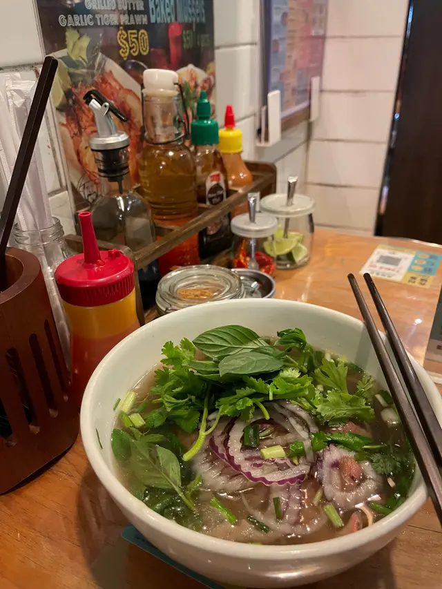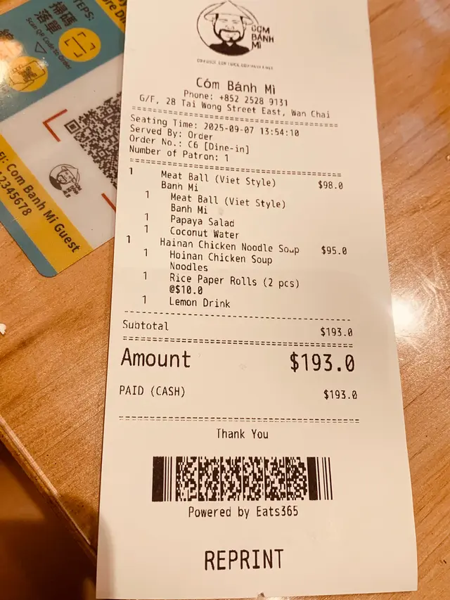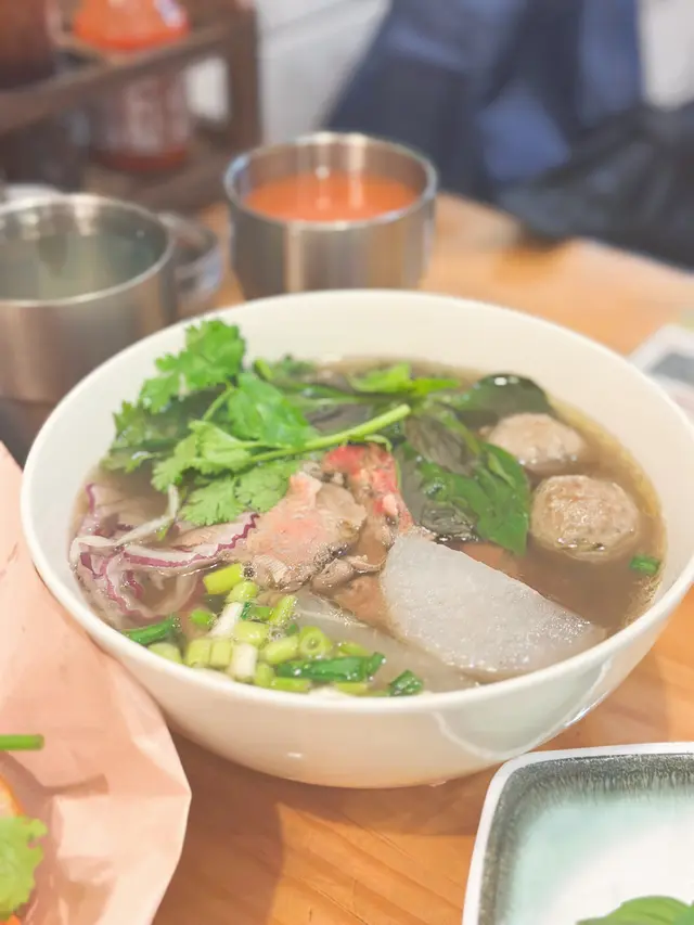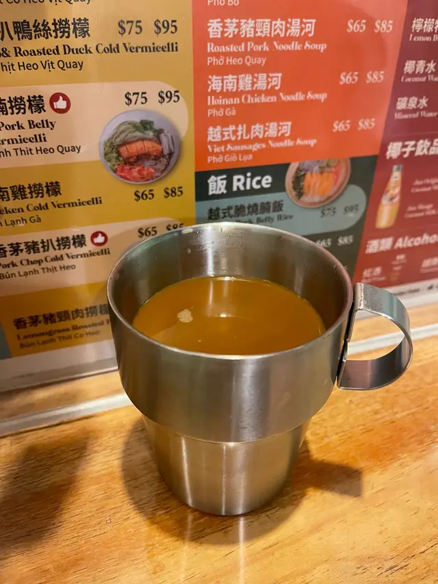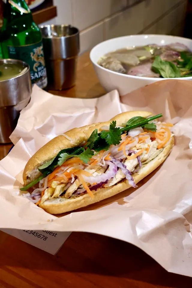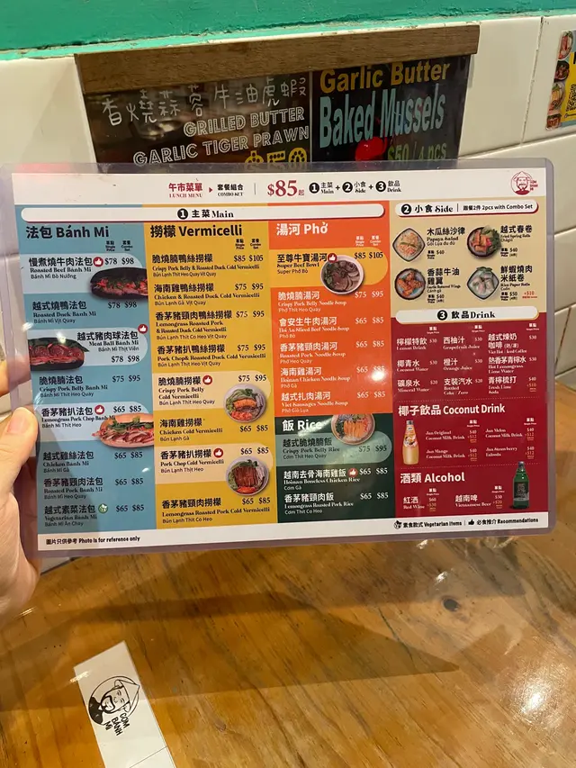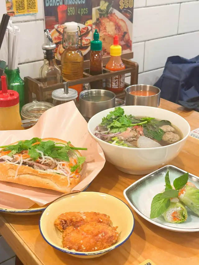 係灣仔發現有間越式小店幾吸引😍原來Cóm Bánh Mì 越.男已經經營左10年店內佈滿壁畫以及裝飾,環境充滿越南風情桌上備有各式醬料,風味滿滿🐷越式豬肉球法包🥖餐廳原創、獨家出品黑色法包乘載四顆豐滿的豬肉球,配上滋味醬汁,賣相吸引豬肉球混有洋蔥粒,咬落啖啖肉汁與洋蔥甜味法包外皮香脆內裡軟熟伴有扎肉酸瓜蘿蔔絲等配料,帶出清新的越菜風味🤤🍜香茅豬頸肉鴨絲撈檬豬頸肉片色澤金黃油潤,肉質彈牙🦆鴨絲處理誠意十足,帶有香脆鴨皮,鴨味香濃淋上越式魚露酸甜汁,在炎夏中享受涼拌酸甜開胃😋🌯越式春捲現炸越式春捲入口熱辣外層口感鬆脆,內裡芋頭綿密、滲出陣陣豬肉油香🐓香蒜牛油雞翼大隻雞翼脆炸金黃,充滿蒜香🧄食落肉質鮮嫩,令人滿足🍋檸檬特飲,味道清新酸爽帶有點點香茅香味,陣陣越式味道🍹西柚汁伴有粒粒果肉入口唔澀,甜中帶酸總結而言,餐點充滿越式風味之餘亦別具特色套餐份量豐富,性價比高👍🏻…查看更多