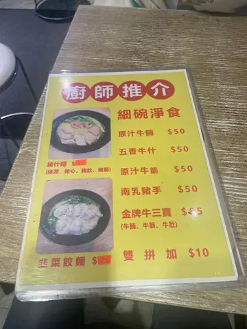 有日去朋友屋企附近食飯,呢間餐廳主要做街坊生意,佢成日都幫襯開就係度開飯。餐廳環境比較細間,無卡位,坐得唔太舒服。不過都知道香港租金貴,粉麵店好多都係咁格局。餐牌種類都唔算太多,但基本野都有齊既。朋友叫左碗雙拼豬手牛筋麵,份量都算OK,豬手同牛筋都煮得幾淋都易咬開。雙併雲吞牛筋麵啲雲吞略嫌有少細粒,一粒雲吞半隻蝦都無,肉餡有啲少,有啲到喉唔到肺感覺。而且雲吞餡裡面啲花生油香味都唔係好夠。麵既質地還好,如果蔥花上面加多少少炸蒜蓉會更加香。牛筋都燉煮幾淋既,而且份量都夠。呢個都值得一讚。油菜呢度要講下,味道一般般啦。如果有啲菜葉個部份會好啲。香港都特別多粉麵舖,呢間質素不過不失,起碼無食到未煮熟既雲吞先。如果要比較既話算係中規中舉個種,如果自己一條友諗唔到去邊食,都係一個不錯的選擇黎既。…查看更多