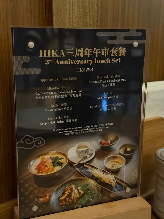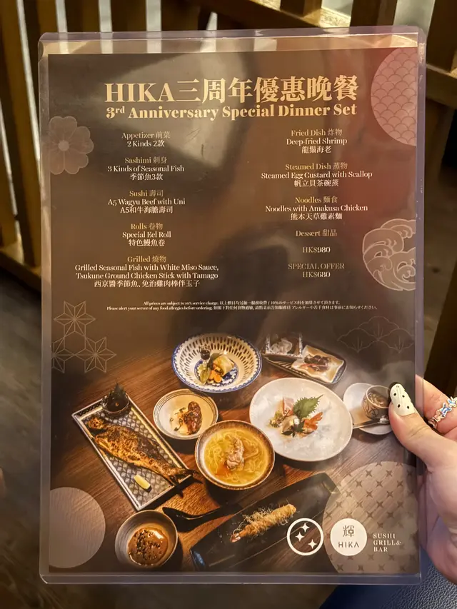 在日本,幫襯得居酒屋的,就要接受店内環境擠迫、座位殘舊、擺滿用過的清酒空瓶、掛滿各類海產的海報,甚至滿場依然不散的燒烤味道,這通通都是日本居酒屋的特徵。在香港的日式居酒屋,我卻找到地方寬敞,適合三兩知己,靜靜地聚聚舊吃點日式美食的地方。這一間位於銅鑼灣渣甸街鬧市 - 輝 Hika,就是一間地方寬落和式裝修的日本食肆了。這天就與女兒來到這裡,靜靜地在這裡商討一下人生大事。一入座見到枱上的餐牌,三週年優惠晚餐有減價就點了兩位。這個餐一共有十度菜式,先到的是桌前小吃,香脆到不得了和有一股獨特的燒烤過的香味之燒鱈魚片,舔上沙律醬去吃更加惹味。前菜二款是來自日本之黑梅貝和螢光魷魚,是新鮮貨色不用置疑。刺身是季節魚三款,全部都是厚切,分別是劍魚腩、拖羅和深海池魚,一啖一口刺身就是滿足感覺。壽司確令人驚喜,是A5和牛海膽壽司,和牛肉經過輕輕炙燒之後,油香即時呈現,海膽是新鮮沒有半點異味,互相配搭之下,來多一件就更好了。卷物是鰻魚特色巻,以pancake 皮包裹著明太子、蛋沙律和鰻魚,以紫菜絲作點綴,煎得香脆的鰻魚,明太子與蛋沙律出奇的配搭,帶出卷物的特色。燒物是西京醬燒厚切鯖魚和免治雞肉棒伴玉子。西京味噌醃過的鲭魚,以慢火燒烤,魚肉保持香滑。而雞肉棒烤得也出色,外層烤得香口内裡免治雞肉没有柴皮,仍然保存嫩滑感覺,配上蛋皇吃來更加幼滑,值得一讚。炸物是龍鬚海老,比天婦羅海老更有特色,以銀絲米粉裹著大虎蝦來炸,又香口又啖啖肉,爽呀。蒸物有帆立貝蟹肉茶碗蒸,是水準之作,茶碗裡的一粒靈魂 - 白果,就能判定這餐廳是正宗一絲不苟一點也不馬虎的做法。麵食是熊本天草雞素麵,天草雞是日本體型最大的地雞,口感煙韌,連雞湯和素麵一起吃,是滋補養生之物。最後甜品選了豆腐雪糕也不錯,給口腔一點甜,給今晚十度美食畫上十全十美的句號。…查看更多
