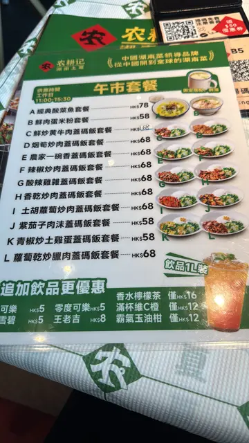 前陣子和朋友去了九龍黃大仙的農耕記。我點的鮮炒黃牛肉蓋碼飯選少辣,牛肉鮮嫩,火候佳,辣味適中,好吃又不刺激。友人的青椒炒土雞蛋蓋碼飯加辣,土雞蛋嫩滑,青椒辣勁足,湘味濃郁。套餐都有例湯,味道鮮美,喝著暖胃解辣。還點了瓶可口可樂,冰爽解膩。從價格看,牛肉套餐$68、雞蛋套餐$63,加上可樂$5,在九龍算合理。這次用餐很滿意,不僅菜品正宗,服務和環境也不錯,是家值得回頭的湖南土菜館,推薦給愛湘菜的朋友,能讓你感受地道湘味魅力。