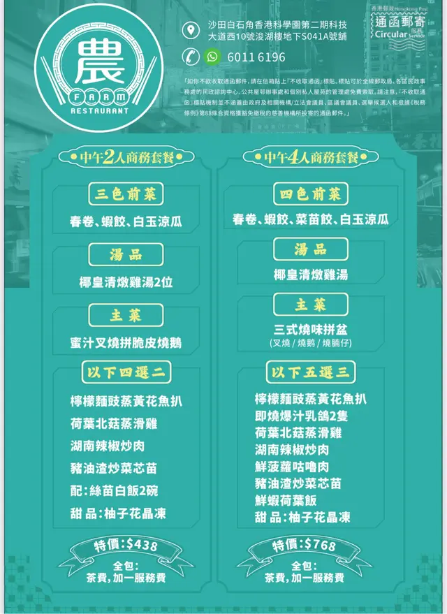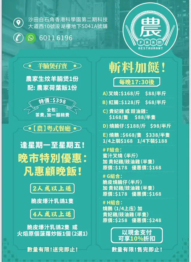 農 (沙田) 網上訂座享低至9折優惠 網址: https://s.openrice.com/QrbS0JWOB00 地址: 香港沙田白石角香港科學園第二期科技大道西10號浚湖樓地下S041A號舖 電話: +852 60116196