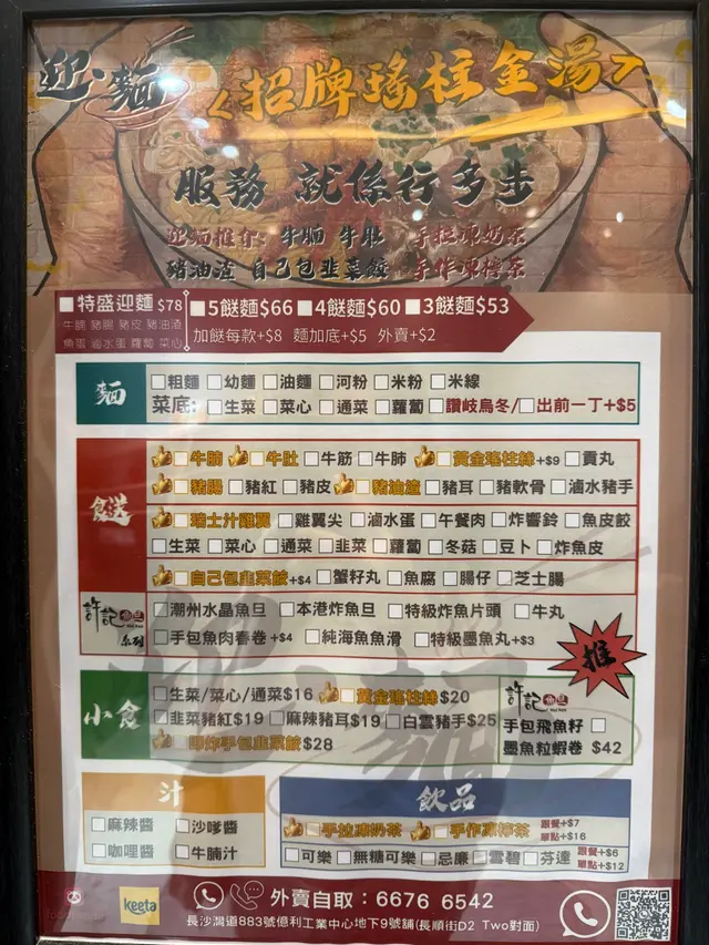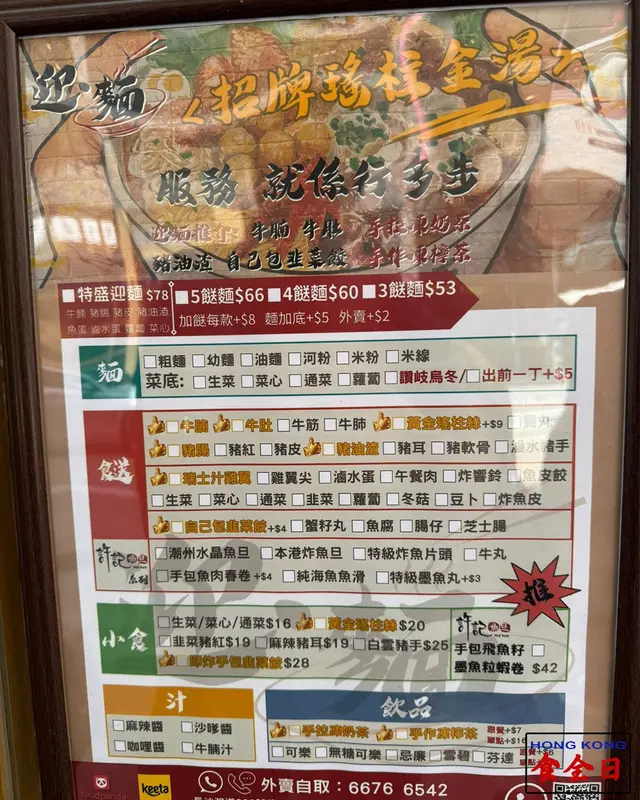 車仔麵絕對是我的學生年代時其中一種經常吃的食物,餸菜款式多又便宜不怕會吃到厭!工作以後就比較少接觸到車仔麵,店越來越少且質素每況越下是主因;最近就聽說了荔枝角一間蠻好口碑的車仔麵店,來一試其招牌湯底是否如評價般令人三回味 五餸麵(轉蘿蔔底) $66自家製韮菜餃 +$4手拉凍奶茶 +7(跟餐價) $18(單點)店家有一樣超強皇牌,就是他們的招牌瑤柱金湯啊!以雞肉、牛骨、豬骨、瑤柱等熬上5小時而成,湯頭呈亮金黃色,濃郁甘甜鮮味足,而且還有滿滿的瑤柱絲,單喝這個湯頭也可以!真的超讚又沒有味精,雖說湯底可說麻辣、沙嗲等選擇,不過眼見店內大部分客人都選這個金湯做湯底,就知道這個招牌湯底就多出色!車仔麵的精髓就在於選擇夠多,雖說店家提供的只有三餸、四餸及五餸麵可選,但其實麵底跟餸菜配料種類非常多!麵底方面有粗麵幼麵油麵等,也可以加錢轉公仔麵或稻庭烏冬;不想吃太多的話可以選生菜、通菜、菜心、蘿蔔等代替,推介一定要吃蘿蔔啊!蘿蔔自身已經夠清甜,再吸收湯頭的精華就更好味~餸菜配料種類相當多,目測有超過30款而且大部份都不用額外加錢就食到了~ 超推薦自家製韮菜餃跟豬油渣,兩款都是由店家親自炮製!韮菜餃size超巨型,兩隻餃子跟平常吃到的4隻份量差不多,皮夠薄餡料新鮮又夠多,咬一口有肉汁也吃到上韮菜的獨特清甜味,單是回想起已流口水了~ 而豬油渣是店家精選上等五花腩煎炸成型,金黃色的外表吃起來酥香沒半點油耗味,邪惡又美味!除了這兩款,也嚐了牛腩、豬大腸跟牛肚,幾款味道都不錯,牛腩炆得入味腍滑;豬大腸處理得很好,跟牛肚一樣都是很爽口!吃了這麼多,想來個飲品的話建議來一支手拉凍奶茶,平常喝奶茶不加糖的我不太會喝外邊已調好的凍奶茶就怕會添加很多的糖份;可這裡的調配得很好,只有很少的甜味但入口香醇奶滑,值得一試啊店家在荔枝角一座工廠大廈地鋪開業只有4個月左右,屬於區內的新食肆之一,不過短短數月就做出口碑來,很受附近的上班族歡迎啊!這裡是採取快餐店做法,先在自助機下單付款再找位置等上菜就可以~ 感覺到店家都是很用心去準備也緊張食物的品質,始終車仔麵其實是一種價格相宜但準備功夫比較多的一種菜式,單是那個湯底就已經覺得太誇張了,而且能夠做到每款食品都好吃其實背後花費很多心思跟努力才完成;而且每位店員都非常熱心好客,由下單到招待客人都不怠慢!現在做飲食業真的比以往有更大挑戰,希望這樣有質素的小店能夠一直堅持也有更多的客人來支持呀…查看更多