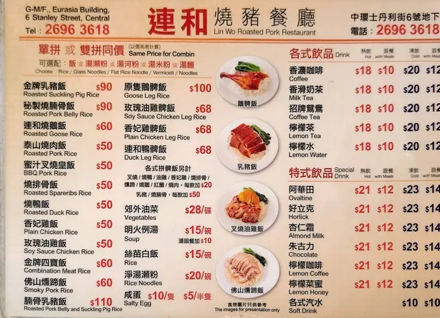 連和燒豬餐廳 (中環) 網址: https://s.openrice.com/QrbS0yLk400 地址: 香港中環士丹利街6號地舖 電話: +852 26963618