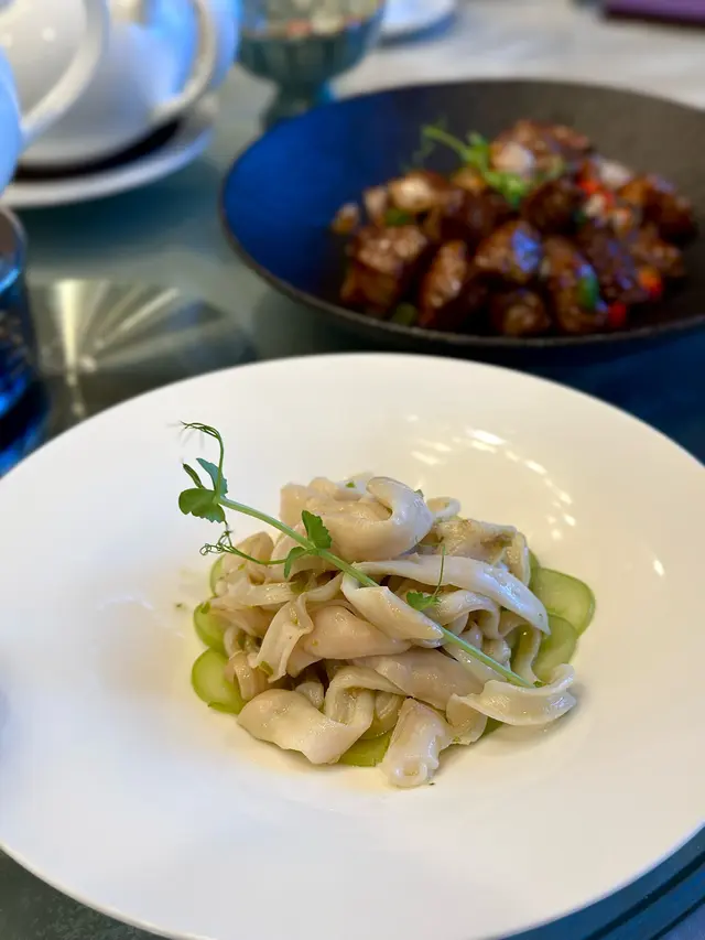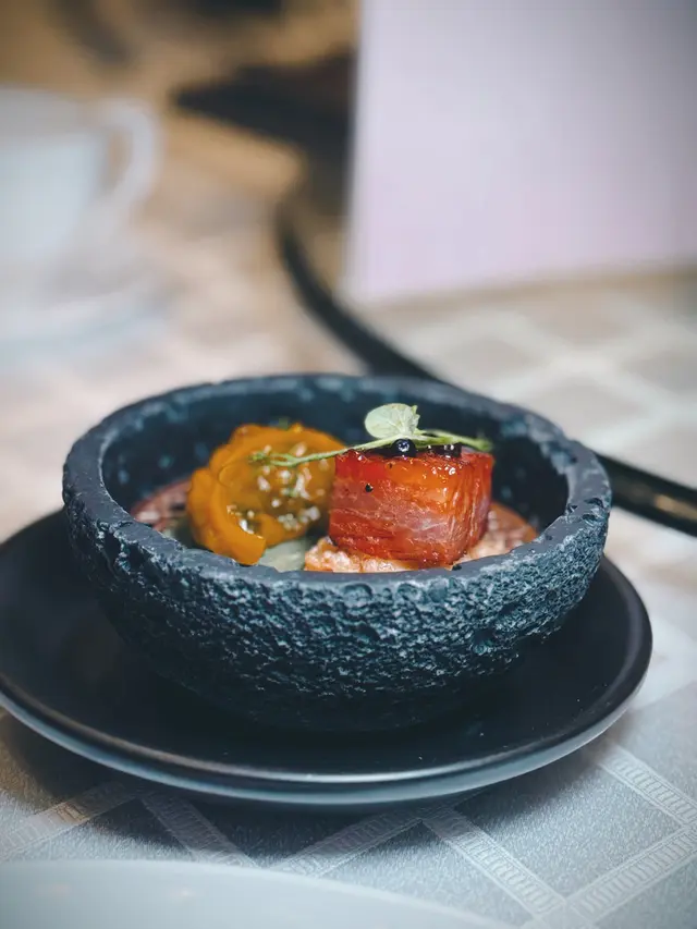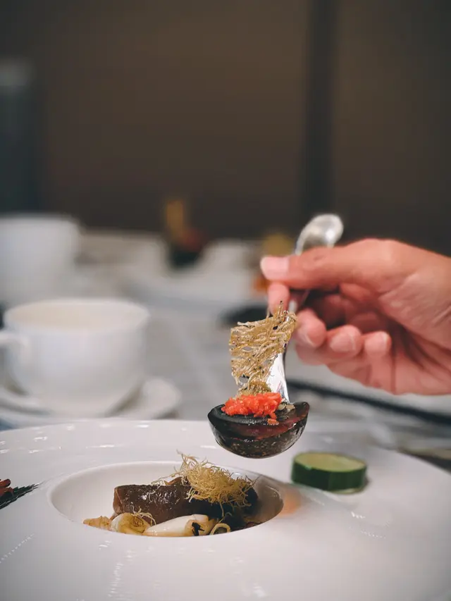 腐乳、蝦醬、蝦乾、點心、奶茶, 一系列充滿香港本土文化氣息的食材, 同樣也被列入非物質文化遺產, 帝港酒店集團區域中式廚藝總監江肇祺師傅與帝逸酒店中餐行政總廚李家鋌師傅合力設計「非遺雅宴‧傳味承真(九道)菜單」, 每道食菜都盛載著相應的製作技藝, 讓我們的味蕾來一趟文化深度遊. 滷醃三品, 吃有次序. 先來墨魚, 其次是皮蛋, 最後是海參. 椒韻墨玉 - 潮式藤椒墨魚吃潮洲菜, 好喜歡吃墨魚片, 這道以傳統潮式滷水滷煮墨魚, 再加微辛辣藤椒汁, 好配搭, 而墨魚又爽嫩, 好好的前菜. 琥珀藏薑 - 子薑尖椒皮蛋. 單單半個皮蛋擺盤精緻, 粉橙色的子薑蓉以秘製醋汁醃漬, 碰上微辣的尖椒碎, 鹹鹹酸酸, 好特別~ 醬香珍味 - 蝦醬蔥燒刺參. 菜式混入蝦醬, 評價可以好兩極, 以蝦醬的咸鮮配海鮮, 海參嫩滑, 非常可口~ 煙燻二品, 一籠兩件~ 分別是籠香玉餃–蒸鴨肉餃子、金縷蜜焰–米通腐乳叉燒. 這個帶著非遺蒸籠及豆品製作技藝. 打開黑圓球, 煙燻效果就像點心在蒸籠般. 以蒸籠把餃子蒸煮, 皮薄餡多. 而叉燒與米通之間有腐乳醬, 意想不到的配搭帶出驚喜, 味道很夾. 翠膽明珠 - 砂鍋菜膽花膠廣東雲吞. 一口大小的「金魚尾」雲吞以豬肉拌蝦而製, 好彈牙! 這並非一般的雲吞雞, 而是以鮮雞、豬骨等熬煮的清澈濃湯, 再加入厚肉花膠, 滋陰養顏. 娃娃菜吸了濃湯, 更顯鮮甜~ 漁港風華 - 避風塘鹹魚茸豆豉煎馬友魚. 超讚嘆大廚以大量蒜蓉、豆酥、麵包糠豆豉、辣椒及瑤柱做出帶有避風塘風味的調料, 甜甜辣辣, 淨吃也好惹味! 肥美的馬友魚加入咸魚蓉及調料猛火兜炒, 香氣撲鼻! 陳滷菌珍 - 陳皮滷水牛肝菌農場雞. 雞件嫩滑, 配以薄切牛肝菇菌、百合、蓮耳、木耳, 少少香氣點綴是陳皮絲, 是平和之中帶點特色. 漁澳風光 - 大澳蝦乾魚肚杞子菜心苗. 好大隻蝦乾而且咬下咸香, 南瓜湯香甜、爽脆蔬菜、竹笙又吸盡湯汁, 吃過剛才的菜式再吃這道, 味蕾有跳入風光明媚的漁村之中. 金炊玉饌 - 脆芋絲臘味蟹肉炒飯. 賣相是有小草地的意境, 幾有創意~ 以火㷫住、鍋內滋滋發響, 所有食材拌勻來吃, 香脆咸香, 好好味~ 說到非遺, 港式奶茶必定榜上有名. 茶啡雙凝是港式鴛鴦茶凍, 一層一層可單獨吃或者三層一起吃, 幾香滑~ 傳統小點 - 麻雀千層馬拉糕、懷舊合桃酥. 「打麻雀」即打牌, 似乎是風假及節慶常備項目~ 這個非遺文化與人類息息相關, 馬拉糕以麻雀造型登場, 立即加分! 這款馬拉糕並非平常酒樓吃到的, 而且夾著奶皇椰絲, 較傳統舊式, 甜度適中~ 而合桃酥好香脆. …查看更多