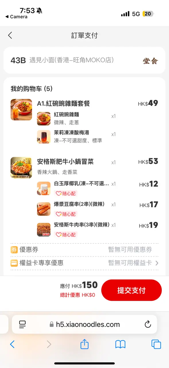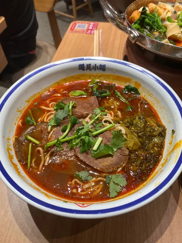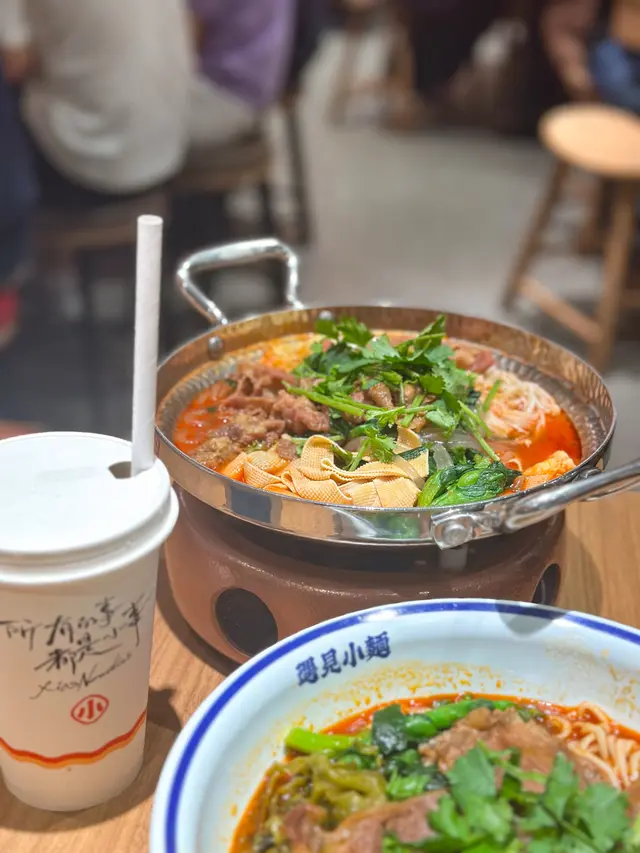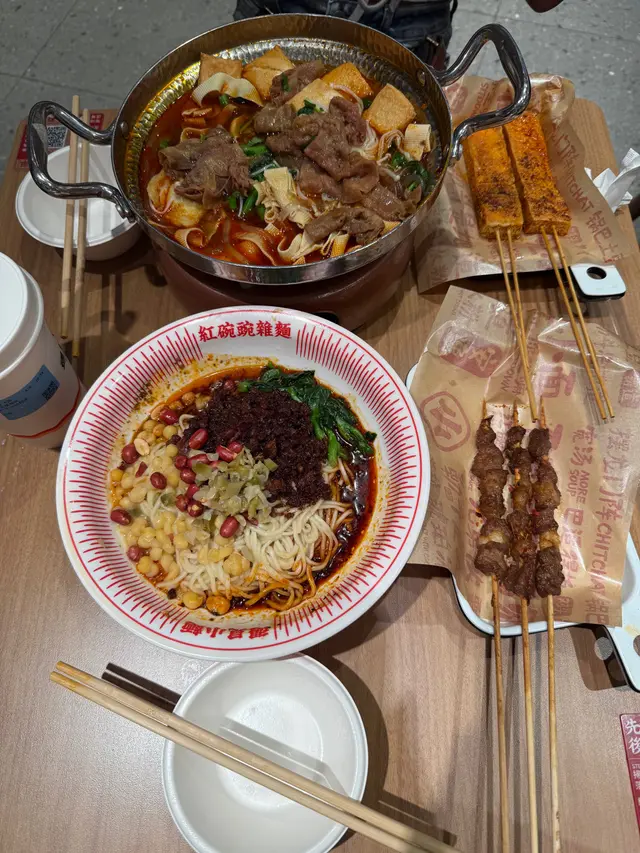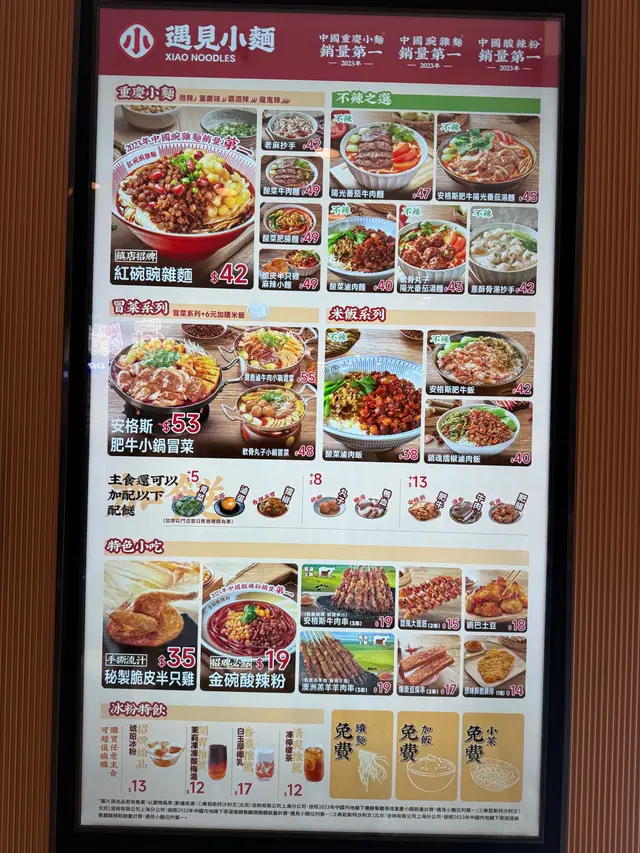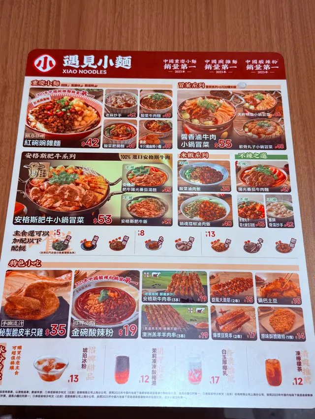 最近去旺角 MOKO 經過內地人氣遇見小麵,這間餐廳朋友也曾經吃過感覺很不錯。這天我們來到,價錢便宜,那就立即入去吃個套餐先。入到餐廳,地方闊落,裝修風格好有特色。餐廳主打這四大招牌系列 : 紅碗碗雜麵、金碗酸辣粉、小鍋冒菜及抄手家族,有辣有不辣,不錯吧。紅碗豌雜麵 $42餐廳招牌菜,必食推介!這碗辣度可選微辣、重慶味、霸道辣或魔鬼辣 ; 吃不到太辣的我,選了微辣 ; 根據指示,把麵條和配料拌勻30秒,肉味香濃,豌豆脆脆,蔬菜翠綠鮮爽,麵條滑身,每一口充滿麻辣鮮香,感受到地道重慶風味美食。脆皮半只雞三件套 $36這個三件套包括有秘制脆皮半只雞+蔥酥骨湯抄手(小份) + 飲品,真的很划算。半只雞份量都不少,皮脆肉嫩,內裡有肉汁,不會乾身,抄手肉餡鮮嫩,熱騰騰的湯底,清甜有肉骨香味,套餐飲品可選擇凍檸檬茶,免費轉配茉莉凍凍酸梅湯及滋潤八寶茶,另+$1 轉琥珀冰粉、+$4 轉白玉厚椰乳。白玉厚椰乳,椰子味香濃,口感順滑潤喉。超值三件套 F3 套餐 $32這套都是下午茶餐,蔥油拌麵+雞排+飮品,亦都很超值。蔥油拌麵可選辣或者免辣,朋友怕辣就選免辣,拌麵份量好足,一大碗滿滿的,把蔥油和醬汁拌勻一起吃,調味恰到好處,香氣撲鼻,雞排外脆內嫩,裡面不乾身,酥脆可口,很美味。安格斯牛肉串 (3串) $19牛肉一口一粒,吃起來很方便,肥瘦均有,嫩滑有肉汁,配搭微辣的調味粉,特別惹味。爆漿豆腐串 (2串) $17覺得這款非常好吃,外層香脆,帶微微辣味,一咬落去真的有爆漿感,豆腐中間好嫩滑,豆味濃郁。白玉厚椰乳 (+$4)套餐飲品轉配白玉厚椰乳,椰子味香濃,口感順滑潤喉。茉莉凍凍酸梅湯天氣炎熱,點了杯茉莉凍凍酸梅湯,口感清新,酸酸地,好開胃。…查看更多