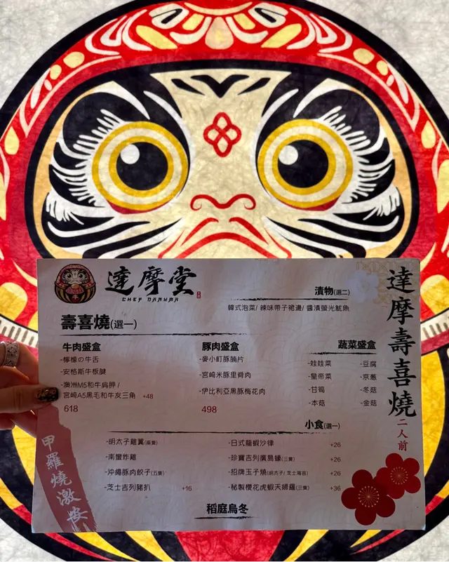 同好朋友慶祝生日🎂,揀咗呢間達摩主題嘅日式餐廳!提前訂位安排左甜品畫碟,壽星女見到個甜品生日禮盒🎁好驚喜!開心到尖叫,仲有即影即有相片留念,氣氛滿分~門口仲有達摩神台同打卡牆,可以寫願望掛上去許願,好有心思🎋食物質素真心高,連飲品都好靚好打卡able,絕對係慶祝之選🥳—*—*—*—*—*—*—*—*—*—*—*—*🔶達摩壽喜燒二人前◼️牛肉盛盒 :宮崎A5和牛友三角/ 牛板腱/ 牛舌和牛油脂分布好靚,輕輕一燒再加入壽喜燒汁,點埋生蛋汁食更滑,濃郁牛香入口即化嘅感覺真係超正!◼️漬物:醬漬螢光魷魚 &辣味帶子裙邊◼️小食:櫻花虎蝦天婦羅🍤櫻花蝦外層炸到好脆好香唔油膩,虎蝦肉爽彈,超好食👍🏻◼️蔬菜盛盒◼️稻庭烏冬食完牛放入蔬菜加上鰹魚湯煮滾,再食埋個煙靭嘅烏冬超滿足!🔶甲羅燒三味好足料呀!撈勻鵪鶉蛋同蟹肉燒,一路燒已經聞到好香,蟹膏味濃郁, 鹹香惹味!🔶北海道抹茶蛋糕🍰畫碟公仔好靚,抹茶味濃香而不苦,口感軟綿。🔶富士雲魅🗻- 椰青水、蝶豆花、奶蓋🔶淡雪之莓 🍓-士多啤梨、鮮奶、蝶豆花、奶蓋兩杯飲品都好靚,杯富士雲魅仲有著燈,打卡必點!—*—*—*—*—*—*—*—*—*—*—*—*營業時間:星期五、六:12:00- 00:00 ▶️9點後正價餐牌79折所有酒水都有買一送一星期日至四:12:00-22:00▶️12:00-16:00 午市正價餐牌有79折▶️午市套餐有買四送一優惠▶️午市單點及壽喜燒/朴葉燒套餐79折…查看更多