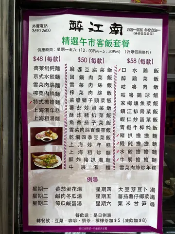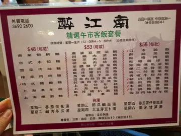 第二次到醉江南午餐,好味,經濟,用心。四個人點了兩個午餐,一份葱油麵,一碗酸辣湯。漁香茄子客飯,不算油,有茄子味,惟我不太喜歡筍,整體可以。鎮江骨客飯,酸甜恰當和味,汁與飯一齊食開胃,夏天食好好,肉軟,整體好味,可再食。這個十分驚喜,葱夠多,油及汁料咸油適中,麵條軟身但不會過林,混合來食十分夾,麵條會吸收少量汁,好味,推薦。這個相對普通,沒有豬紅,豆辦醬味,不酸,不太糊,夠四人一人一碗,還可。客飯跟湯或豆漿,豆漿好夠豆味,湯亦每日不同,可以再試。整體,店不大,午飯時段一直都滿坐,大枱只有一張,屬小店,味道,價格相宜,值得再訪。…查看更多