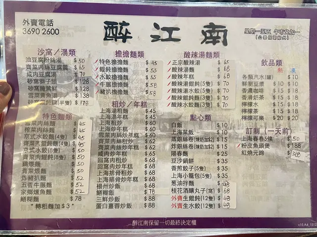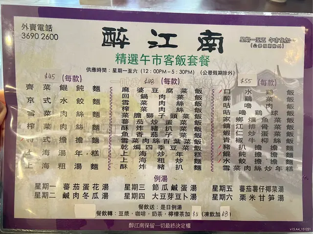 第二次到醉江南午餐,好味,經濟,用心。四個人點了兩個午餐,一份葱油麵,一碗酸辣湯。漁香茄子客飯,不算油,有茄子味,惟我不太喜歡筍,整體可以。鎮江骨客飯,酸甜恰當和味,汁與飯一齊食開胃,夏天食好好,肉軟,整體好味,可再食。這個十分驚喜,葱夠多,油及汁料咸油適中,麵條軟身但不會過林,混合來食十分夾,麵條會吸收少量汁,好味,推薦。這個相對普通,沒有豬紅,豆辦醬味,不酸,不太糊,夠四人一人一碗,還可。客飯跟湯或豆漿,豆漿好夠豆味,湯亦每日不同,可以再試。整體,店不大,午飯時段一直都滿坐,大枱只有一張,屬小店,味道,價格相宜,值得再訪。…查看更多
