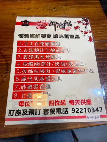 餐廳最近推出了一個性價比很高的套餐,人均200元就能吃到8個不同的菜色,部份更是海鮮,份量也是非常足的,難怪餐廳人氣那麼足了!懷舊海鮮饗宴(198元/位,4位起)手工百花釀蟹鉗表面炸得金黃香脆,內裡是用蝦滑包裹著的蟹鉗,口感非常彈牙,又有蟹肉的鮮甜。古法鮑汁什燴荷葉飯有儀式感,給了剪刀讓你自己剪開。一剪開就聞到濃濃的荷葉香,賣相有點像糯米雞,但吃起來挺香的,是炒飯底配上大量的湯汁和配料,味道香濃惹味,還有點蝦仁,豬肉等。碧綠黑木炒班球用的是龍躉魚片,大大片,口感彈牙,有魚香,用薑蔥蒜來炒香,配上脆肉瓜和木耳來增加口感。炒蝦碌選了茄汁炒,味道酸酸甜甜的,挺開胃,蝦亦挺大隻的,口感彈牙。蜜椒脆薯牛仔粒用的竟是脆薯餅,口感更加香脆,配上甜甜鹹鹹帶點黑椒香味的醬汁,特別惹味,牛柳粒也挺嫩滑的。脆米胡麻醬元貝挺特別的搭配,炸得表面香脆,內裡滑嫩的元貝肉,配上酸甜的胡麻醬,挺解膩的。砂鍋雲吞雞足足有半隻雞,而且口感滑嫩,雞湯濃厚,雲吞大大粒,更是鮮蝦雲吞來的,口感更彈牙,味道更鮮。上湯浸時菜今天的是豆苗,口感嫩滑。椒鹽九肚魚(118元)份量不錯,炸得特別香脆,九肚魚入口即化,味道鹹香。醬滷鵝(138元)跟平常的滷水鵝不一樣,肉質較結實,有鵝肉香,醬油味突出。…查看更多