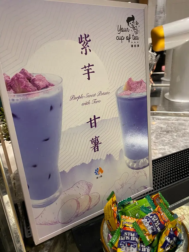 服務在門外放有排隊位放有個牌,精美又清晰,係付錢位上方亦有顯示螢幕,付款位亦有飲品牌,好窩心的服務,方便我地睇牌。另外,門外仲有自助購買機,人多時唔洗排隊,非常方便。四季春奶蓋茶我已經第二次買里的茶,上次飲茉莉奶蓋綠茶,今次買四季春奶蓋茶,第一啖似奶蓋超好飲,再飲耐啲飲到啲茶,非常夾,四季茶唔太濃,仲好滑。紫芋甘薯紫芋甘薯係新產品,一去付款櫃枱見到個牌好似好吸引,而且我好鐘意甘薯,於是叫左杯試下,好香香芋味,似落可以飲到兩種味,好好飲。…查看更多