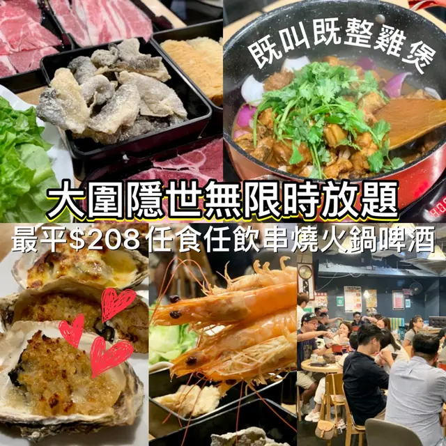 餐廳位於大埔美林邨附近,外圍以冬菇亭建築物搭成🍄 主打任飲任食唔限時嘅雞煲🐔 串燒🍢 同打邊爐🍲 放題😌 雖然地方偏遠但價錢親民而且食物高質,一次過滿足你三個願望😍 極力推介三五知己過嚟傾偈食包佢👍🏻🍲 雞煲串燒火鍋放題套餐 兩個人去會有半隻雞嘅雞煲🙈 上枱時已經係八成熟,焗幾分鐘就食得啦!雞肉件較細但好入味而且唔嚡口,醬汁夠惹味,唔係死鹹,鑊氣十足😚 另外配上大量芫荽同洋蔥片令到成個香氣更濃郁,十分滋味🥰串燒點咗必食嘅蒜燒蠔、芝士蠔🦪 同海蝦🦐 生蠔係中等size,完全無沙而且好新鮮,超級厲害😌 海蝦都唔輸蝕,爽脆彈牙夠juicy😝呢度嘅火鍋唔係食完雞煲後再加水,而係用另外一個煲再揀湯底🤩 想健康啲可以叫花膠雞濃湯,有大大片嘅花膠😉 而且仲有紅棗、杞子、蟲草花等食材熬成,真材實料,味道鮮甜得嚟夠滋潤😍 幸福感滿滿的🥰 配料方面有成30幾款任君選擇😋 肉類包括安格斯肩胛牛肉🐮 黑毛豬🐷 同酒釀雞件🐔 最推薦安格斯牛板腱🥩 牛味重,肉質軟腍得嚟帶點咬口,係幸福嘅味道呀😜 另外仲有海鮮類、丸類、蔬菜類、麵食等😋 不過建議大家都係留返個肚食回本嘅肉同海鮮啦🤣飲品裝滿兩個大雪櫃😆 除咗有汽水🥤 紙包茶之外仲有大家喜愛嘅啤酒同比較特別嘅清涼爽,超級齊全,值得一讚😝查看更多