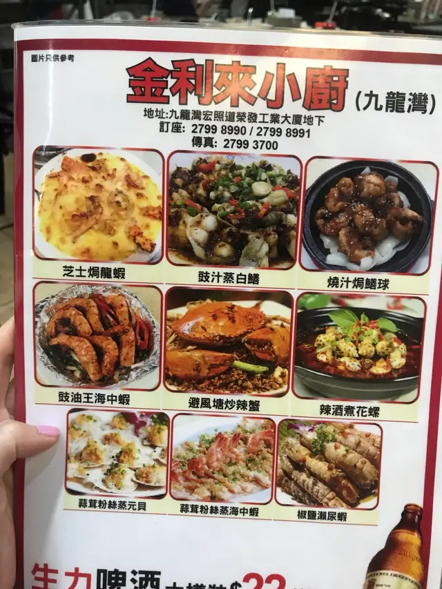 今日約左班佬緊系去食小炒啤啤佢個fd就推薦去試下九龍灣既金利萊一入到去都好有大排檔feel而且有好多野食,真系好難簡呀炸豬手 味道唔錯,個皮炸得好靚,但肉有d老,而且配沙律醬好似怪怪地蒜蓉粉絲蒸扇貝勁大隻,蒸得岩岩好,扇貝唔會太老,個汁好好味配埋蒜同蔥,粉絲索曬d味,一流!!啫啫通菜煲味道好濃,配埋d肉碎食一流,而且通菜都好靚芝麻雞好多芝麻痴系雞上面,味道好香,而且雞肉肉質都唔會好淋魚香茄子煲送飯不得了,有少少微辣,更加惹味個日仲好好彩,咁岩撞到唐詩泳都系個到食飯,好靚女呀,可惜唔夠膽去同佢影相,哈哈仲見到江若琳,c君整體唔錯,4個人食連埋飯同啤酒一人都唔洗200蚊野食質素都唔差,好有獲氣,而且侍應服務態度都幾好環境有好大排檔個d feel食落都特別爽查看更多