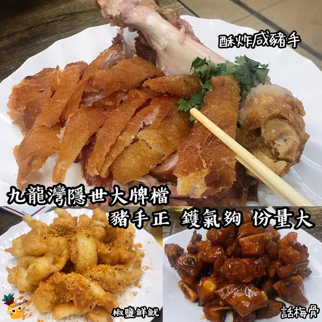 出賣我既個人飯堂比大家🤔又係回憶之食堂🙏我嘅個人食堂未必係最好食嗰間😗但係一定係我食得最舒服嘅一間😗 今日嗰間有一味餸一定要叫,就係佢地既豬手🤪佢哋有一個秘製醬汁🤤食完返唔到轉頭😗講返個排行榜😗由於大牌檔越來越少,所以酒家,菜館等等我都會放埋入去😂其實今日嗰間都唔係大牌擋,不過為咗呃大家睇😛冇所謂啦😗-🐖大牌檔的起源🐖大家又知唔知大牌檔點解叫大牌檔 係50,60年代 政府見到香港經濟唔好 所以發d牌出去 等大家可以搞下食店 刺激下經濟🙂 而政府發果個牌 比一般食店既牌大 所以就叫大牌檔啦🙂 現今香港大牌檔主要係中環同深水埗 之後幾年前 政府又玩一牌兩制 只係比中環既大牌檔傳比下一代 深水埗或其他地方既大排檔就唔比所以少一間 就冇一間架啦 大家想珍惜機會去食 同去感受一下 香港舊時代既風味☺️-🐽#酥炸咸豬手🐽($148)份量幾大,皮炸到超脆口🤤皮加少少肥好鬼正豆😗 最特別係佢個芥末醬🤩少少辣,令到個豬手冇咁油膩😗而且超開胃,次次都要佢俾多啲我🤩食完仲可以拎返條骨比隻狗食😛.🦑#椒鹽鮮魷🦑($95)大牌檔必叫系列🤭 亦係啤酒殺手🍻炸醬上得夠薄,食落彈口惹味🤤但係可以再辣少少😂咁就會更正🦑Btw 始終中意九肚魚多少少🤭.🐷#話梅骨🐷($90)第一次食呢個,朋友話要叫😂食落酸酸甜甜🤪 超級開胃🥚而且一粒粒,慢慢吸,幾過癮😗總結來說 中上既餐廳 值得去食-🎈 香港, Kowloon Bay, 宏照道23號平均傷害:$150好味值:7.5/10-撚手小菜麻甩排行榜 (個人口味)1. 萬發海鮮飯店 (8.5/10)2. 愛文生飯店 (8/10)3. 金利來小廚 (7.5/10)4. 鳯城酒家 (7.5/10)5. 榮記(東成)飯店 (7/10)6. 祥囍煲仔小廚 (6.5/10)7. 明記飯店 (6/10) ...查看更多