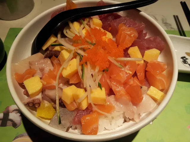切粒什錦魚生飯所有餐都包一杯汽水, 如果要叫檸茶o個d就要加錢魚生飯雖然唔係大大件的魚生不過都好多款, 同好有光澤好新鮮咁有蟹子, 三文魚, 吞拿魚, 魷魚, 蛋, 立魚飯都係用上珍珠米食倒有少少醋味, 好開胃