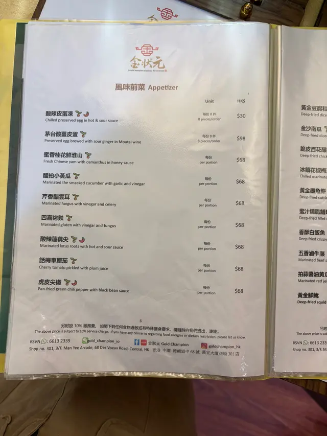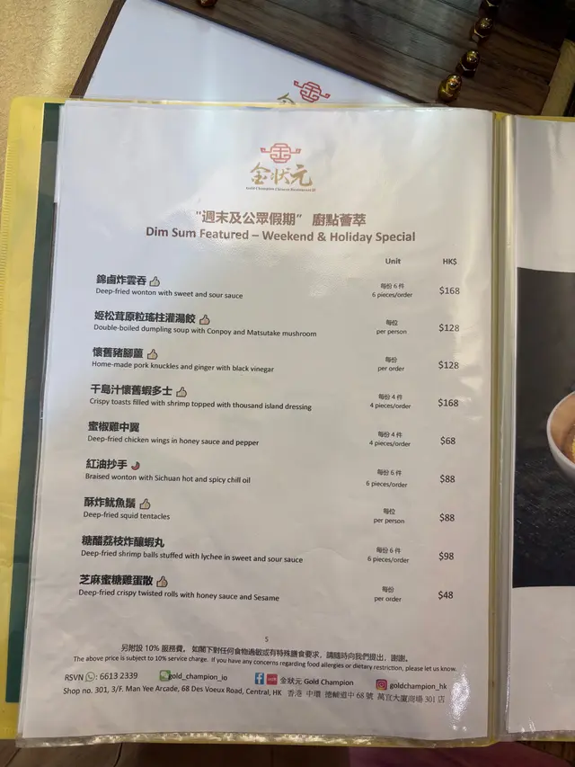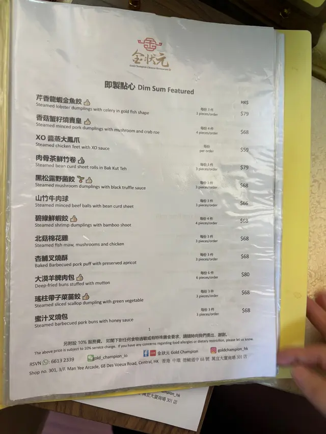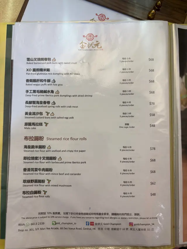 金狀元 (中環) 網上訂座即賺Rice Dollars 網址: https://s.openrice.com/QrbS0e8mD00 地址: 香港中環德輔道中68號萬宜大廈3樓301號舖 電話: +852 66132339