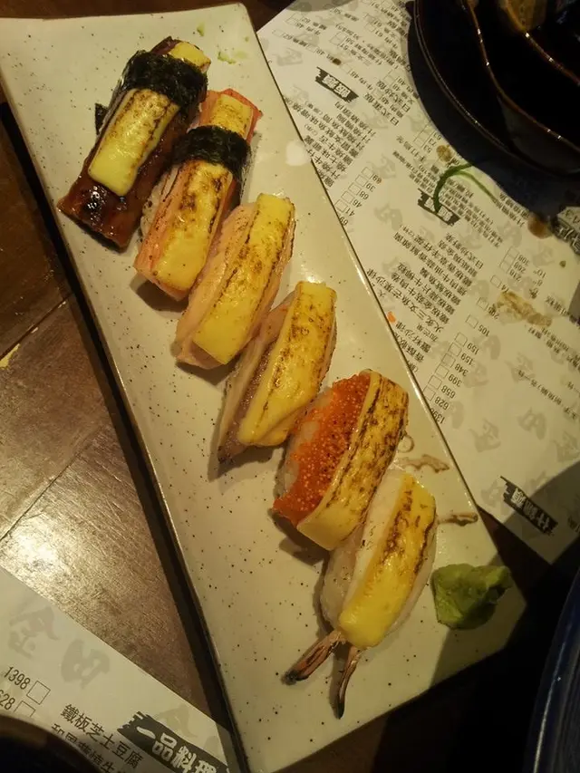 今晚我們去咗元朗大坑渠旁邊嘅「金田壽司刺身店」食晚飯!我們叫咗八點八吋長壽司盛、特選長壽司盛、蟹籽沙律「大」、金田火山卷、芝士年糕、手打冷烏冬、野菜豆腐鍋同鹽燒鷄腎!開頭令我充滿其待嘅八點八吋長壽司盛同特選長壽司盛,嚟到之後見到個賣相同色澤已經令我們好失望, :( 點知一食落口就令我們後悔莫及點解會選擇嚟食,