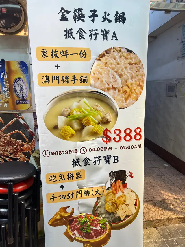 位於新蒲崗的金筷子,唔係旺區,卻有一班街坊支持,坐低都未感到咩特別,食落就知真材實料!生猛象拔蚌刺身:新鮮鮮甜到不得了!口感係爽脆彈牙,味道係鮮甜中又帶點點海水的咸味!點wasabi食正呀!亦可以喺火鍋淥一淥,都無損佢嘅鮮甜味!鮑魚: 正!老闆將佢簡單處理過,可以就咁生食,係爽脆的口感,咬落有啲似鮮帶子的味道,我再將佢過火鍋淥一淥,外熱內涼都好食!每款海鮮都好新鮮好食,包括有蟶子同生蠔,大隻飽滿,都係食得出的鮮甜!花膠有5件,食到軟滑的質感,啖啖骨膠原,好正!封門柳新鮮富有牛味,肥瘦均勻,一咬就開!手打墨魚丸同埋雲呑食得出的真材實料,大大粒,又好新鮮。總括來講,每款材料都係新鮮及真材實料,我花$588食得滿足又快樂!