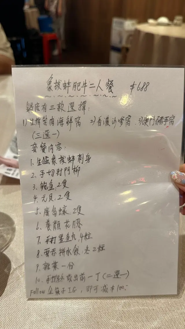 最常來既金筷子😍無限推介俾親朋好友🤣好野要share !温暖既家庭式邊爐店🉐象拔蚌‼️‼️務必一定一定要叫鮮甜!彈牙!刺身又正,滾佢兩秒又得~海鮮絕對無得輸仲可以預訂新鮮魚❣️珊瑚蚌,桂花蚌仲要蠔海鮮大王咁款🤣牛肉,高質🤝霜降牛肉~重牛味,斌哥都覺兩個會韌👍🏻手打丸又係必食墨丸丸咬到粒粒咬口同埋芝士丸好濃👻每次來又試下其他款基本樣樣都正正!無失望㊙️飲飽食醉最幸福☺️性價比best #letsgoeathk#hotpot…查看更多