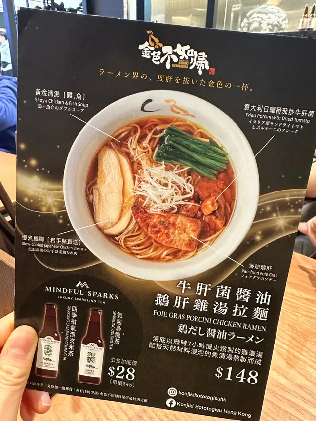 想黎呢間連續五年有東京米芝蓮星星既「金色不如帰」好耐啦 近來開左間分店係黃竹坑既The Southside 見有新拉麵 就決定放工約埋朋友一齊食牛肝菌醬油鵝肝雞湯拉麵店員介紹呢個新推出拉麵湯底用7小時慢火燉製鮮雞濃湯 加埋天然材料浸泡的魚清湯熬製而成 拉麵送上黎已經聞到好香 飲啖湯好香甜鵝肝煎到表面微脆 咬落入口即溶低溫慢煮雞胸保留左豚肉香味拉麵入口煙韌 加$28 有支Mindful Sparks氣泡烏龍茶或者四季柑氣泡玄米茶我鐘意四季柑的果香和氣泡茶的口感 貝汁醬油拉麵呢個湯底由秘製大蜆湯混合豚骨湯及清魚湯三重湯底 個湯底微鹹帶甜 好有鮮味湯入面加左黑松露醬 牛肝菌粉及牛肝菌油有兩塊醬油蒸煮豚肉片 追加左配料溏心蛋 低溫叉燒 小棠菜低溫叉燒肉質軟嫩查看更多