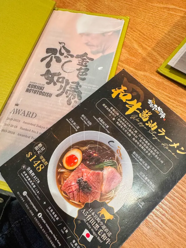 總結: 金色不如歸作為米芝蓮一星拉麵品牌,食物質素有一定水準,貝汁鹽味拉麵鮮味突出,涼拌墨魚清新有層次,但整體份量偏少,加上價錢偏高,性價比不算理想。環境舒適,服務流暢,適合偶爾一試,但低機會回訪。叫左嘅食物有:貝汁鹽味拉麵(午市Ramen Set)【7.6分】- 麵條屬幼身,掛湯力不俗,口感彈牙;配料如叉燒、蔥花、筍絲等擺盤整齊,但份量略少,未能完全滿足飽肚感。輕盈涼拌黑松露紋甲墨魚【7.5分】- 墨魚切片薄身,口感爽滑,黑松露香氣點到即止,不會過於搶味,整體味道清新,適合作為前菜。飲品:Coke Zero環境: 店舖裝潢走型格簡約路線,座位安排舒適,枱凳整齊,適合輕鬆用餐。服務: 店員態度正常,點餐流程順暢,上菜速度快,整體體驗流暢。價錢: HK$184.8(加一後); 人均 HK$184.8進食時段: 午餐時間評分: 6.9/10詳細評分解釋: 綜合食物(味道與賣相)、環境(氣氛、空間、衛生)、服務、性價比四方面作整體評估。比分偏重食物與飲品部分。- 1‐5分: 不推薦- 5‐6.9分: 普通,低機會回訪- 7‐8分: 都可以,會考慮回訪- 8.1‐9分: 相當不錯,大機會回訪- 9.1‐10: 各方面都好好,一定會回訪整體而言,金色不如歸作為東京米芝蓮一星拉麵品牌,湯底確有特色,特別係貝汁鹽味拉麵鮮味突出。但考慮到午市套餐價錢接近$200,而份量偏少,性價比不高,若非特別想試米芝蓮拉麵,未必值得專程前往。查看更多