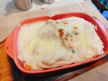 好耐無食呢啲懷舊風鐵板扒房,又平又抵食。店面唔大,我地揀左bar 枱坐,都坐得幾舒服。一個餐有齊餐湯,餐包,野飲同甜品,大滿足。忌廉湯個味好懷舊,好耐無飲過,好味~個碗都好靚!餐包係蒜蓉包,焗得唔燶又鬆化,讚!加多左個淨蒜蓉包食~叫左個雞扒焗飯,加左2粒吉列帶子同珍寶腸,跟洋蔥汁,新鮮焗出黎好好味!洋蔥汁都較得唔錯,飯夠乾爽,如果有炒飯底會更好,而雞扒都好嫩滑!男胖子就食12oz 嘅紐西蘭牛扒,真係好大塊,一塊鐵板都裝唔哂,淋左黑椒汁喳喳聲勁香,肉質都唔錯,鬆軟得黎又好香口,而個薯條都係新鮮炸,好味~野飲就揀左熱杏霜同凍檸茶,有水準。甜品有啫喱同雪米糍揀,我地試左好少有得食嘅青檸啫喱,加埋花奶好味~