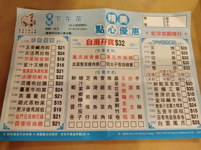 今日去咗食下午茶, 對呢間嘢印象十分之差! !!食物質素ok但服務態度所有嘢都真係完全唔掂唔會想再嚟! 簡單講下發生咩事令我去寫第一個評論!1. 不停漏單,明明點心紙寫得清清楚楚,都可以漏三樣嘢。因為上次屋企人已有漏單嘅情況,所以我哋今次有check單,發現嘅時候我地即刻同返落單個姐姐講,佢話唔好意思會幫我地加返,但我地等左好耐都未到,再追嘅時候佢地竟然同我地講無落到,而且廚房已經走左整唔到,個經理仲要走埋黎話係我地無落單!😡😡😡2. 下午茶時段係兩點到四點,但兩點半入嚟好多點心已經冇晒,無飯無麵無腸粉無叉燒酥乜都無😵😓3. 本身係叫炒飯, 但上咗鳳爪排骨飯。而且姐姐放落黎嘅時候完全無對單。鳳爪排骨飯仲要比我地叫嘅價錢貴, 佢冇通知我哋冇嗰個飯就自己自行幫我哋轉咗😵💫4. 下午茶時間明明係二至四,但兩點半好多點心都無晒不特止,三點嗰陣想加單啲姐姐仲話廚房已經收爐走左,三點半仲有成枱野未食完,個經理已經畀單我哋叫我哋出去買單,過多五分鐘仲要熄埋冷氣同燈趕人走,而嗰時大概仲有六張枱嘅人,其他食客都未食完。大家仲食緊啲員工已經過嚟講話佢哋要打掃啦🤬🤬🤬🤬🤬🤬都未計佢地上菜撞瀉我哋啲茶,唔加水又唔收洗杯個兜,吉嘅點心籠又唔收!!!呢間酒樓唔會有興趣再去食囉,趕客趕到咁,唔怪得長期都咁少人去, 係有原因的!!!…查看更多