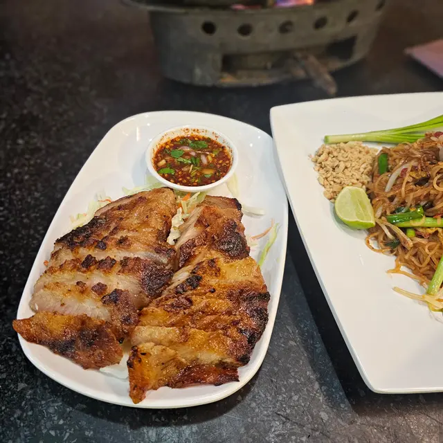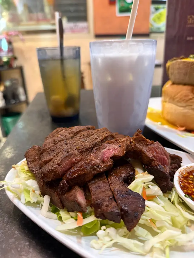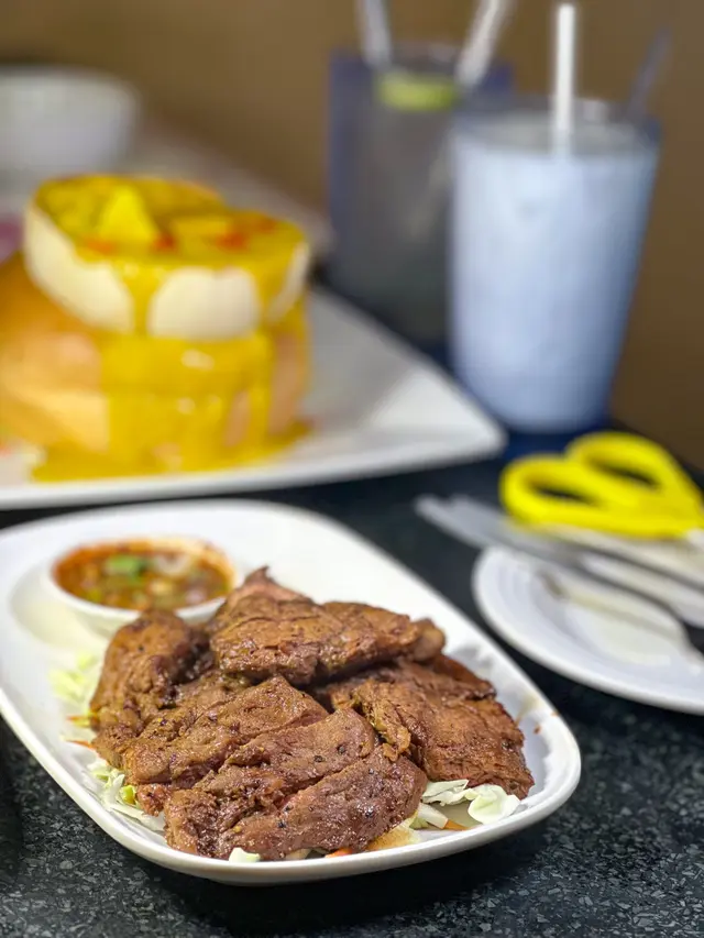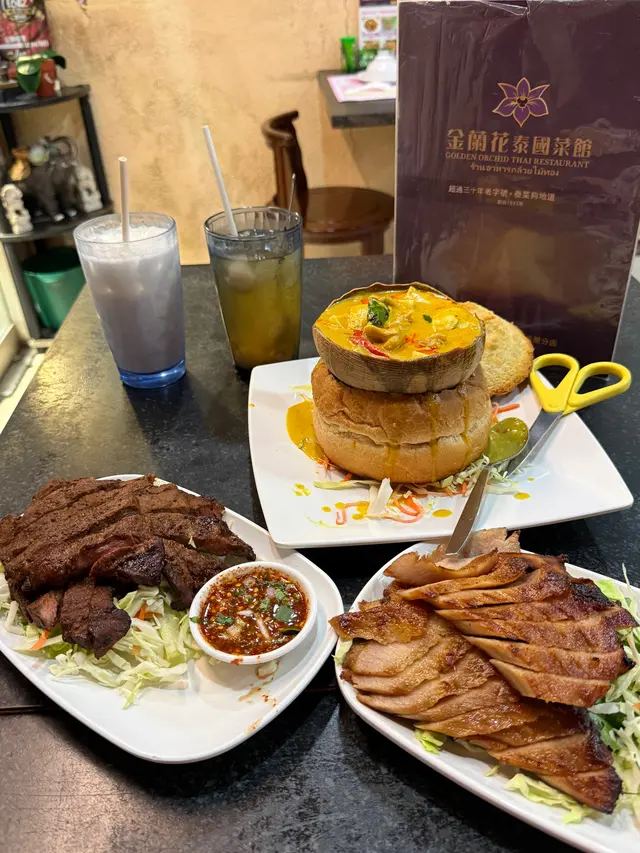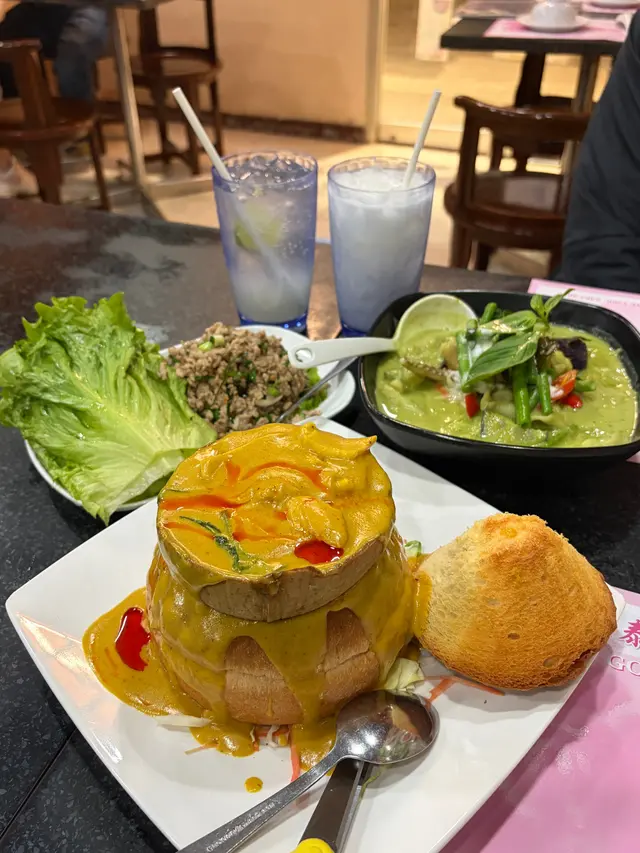 今次嚟到開咗至少30年嘅九龍城泰國菜~一入到去全部都係泰國人侍應,都已經充滿泰國風味!目測到其他食客嘅份量都算大份,我哋都叫咗三款比較熱門嘅菜式試一試😍我哋好彩晚上6點算早入座,因為食食吓已經陸陸續續見到出邊已經排隊….泰式生菜包平時係我最愛,所以食泰國菜一定要叫,呢度的生菜包酸酸辣辣又惹味,用生菜包住好清新爽口,同泰國食差不多,都值得一試💪泰式燒牛肉都幾多人叫,我哋都試咗一份~肉類嘅份量都算多,燒牛肉新鮮即燒,牛肉半生熟,保留住濃厚嘅牛肉味~再點埋佢哋個秘製酸酸辣辣的醬汁,加埋辣得幾過引🫣食唔到辣的人會噴火…黃咖喱雞大圓法包🥖係正宗嘅泰國甜黃咖喱,椰香味濃郁,喺個咖喱入邊仲見到椰子肉、蝦肉、雞肉~都幾足料!雞肉都算嫩滑唔難口….值得一讚嘅就係佢的大圓法包,麵包軟得嚟,外皮又鬆脆….用嚟點咖喱真係畫龍點睛,食包仲好食過食雞😂好似食錯重點….叫咗兩杯飲品味道都唔錯~分別係龍眼冰,味道清清甜甜嘅龍眼味~都幾清新,表面龍眼肉都好多~都幾足料!椰汁冰都唔差,有非常濃郁嘅椰子肉味,都幾甜,都值得一試!整體店員服務態度都唔錯,而且店舖嘅環境氣氛都充滿泰國餐館feel!屹立咗30年嘅小店,值得支持下😆…查看更多