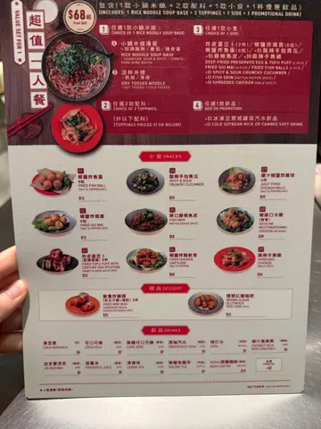 新開的旺角店,新裝修坐得好舒服,星期六晚人流都好多,但係流轉得好快,都唔洗等位而且店舖職員,應該係經理,勁有禮貌,好好笑容,對每位客人都有關心! 食落都開心D~🥢酸辣小鍋米線 – 1人餐- 金獎腩肉+紅蘿蔔粟米魚蛋+鹽香手撕雞湯底色澤橙紅,酸辣香氣撲鼻,米線滑溜彈牙,吸曬湯底嘅精華,每一啖都夠晒惹味金獎腩肉肥瘦分明,肉香同湯底嘅酸辣味好夾鹽香手撕雞肉質細嫩,鹹香入味,雞味濃郁,咬落去又唔會乾柴,配埋酸辣湯底更加突出雞肉鮮味🥢椒鹽炸魚蛋粒粒圓渾飽滿,魚蛋彈牙多汁。外層灑上椒鹽同少少辣椒粒,鹹香帶辣,食到尾口都唔會覺得膩🥢自選酸辣小鍋米線- 金獎腩肉+芫荽魚蛋+冬菇芫荽魚蛋加入新鮮芫荽,魚蛋帶住淡淡草香,食落更加有層次感🥢炸皮蛋豆卜 – 配甜酸醬外皮酥脆金黃,夾住咸香嘅皮蛋,皮蛋煙韌,味道濃郁,配埋豆卜嘅軟綿,層次分明,點埋甜酸醬,酸甜開胃,完美中和咗皮蛋嘅鹹香🥢爆漿紅糖糍粑賣相精緻,外層炸到微微金黃,咬落去外脆內糯,黏糯煙韌。糍粑入面夾住濃郁紅糖漿,一咬開紅糖即刻流出,香甜軟糯,唔會太膩…查看更多