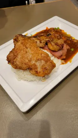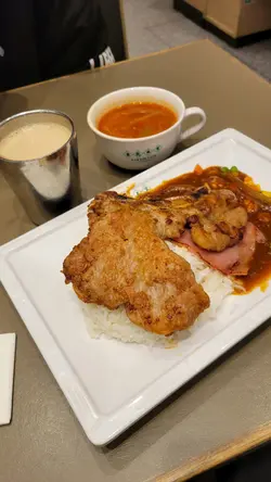 今日趕時間,同亞仔來一個快閃餐,其實週圍好多餐廳,見金記今日唔係好多人排隊,就決定响呢度食,餐廳裡一排排卡位,都算坐得舒適!點咗兩份午餐,套餐包括主食、羅宋湯或老火湯、餐飲,睇番價錢都算抵食。洋蔥豬扒拼火腿飯豬扒炸得外表香脆,內裡還有些汁,中規中矩喇!黑椒义燒炒意粉,义燒和意粉味道可以,再加多些黑胡椒,味道更佳!餐飲叫咗即磨咖啡和奶茶,咖啡還比我預期中好,可以一試!總括來講,餐廳除咗早、午餐,其實全日都有好多選擇,例如焗飯、粉麵、小炒套餐、扒餐;牛扒大大件,仲係用鐵板上!食品各式其式,下次搵時間再來試試其他✌️