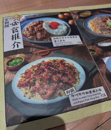 -行完觀塘工廈又唔知食咩、最後揀咗金飯館食佢最出名嘅炒飯,下面全部飯都係炒飯底本身我都打算叫豬扒飯、見到其他枱嘅成品都係成座山咁😂,為咗減脂最後我叫咗蝦頭油炒飯,炒飯炒到十分乾身,除咗蝦仁、大量櫻花蝦同埋蠔之外,本身個飯都蝦味十足食落非常過癮,同時我亦都加咗$15去食佢嘅蘭王蛋,單點另上幾貴🙂,食完我覺得冇咩特別可以唔使加隻蛋凍檸茶好彩唔係手打檸檬茶、而係茶餐廳普遍嘅凍檸茶,茶底都好夠味,唔會好多冰☺️之後我有同其他朋友交換食,黑松露炒飯,有少量帶子粒、蝦仁同白菜一齊炒,黑松露味唔會話太過出,相對起其他炒飯,有點遜色即炸豬扒燶邊蘭王蛋飯,逢親有豬扒嘅炒飯,都係好似成座山咁,得呢一個飯係包埋蘭王蛋,豬扒炸到非常脆身、亦都係超級厚身大件,成個飯簡直就係邪惡嘅化身,只係椒鹽豬扒太過出色、太過入味椒鹽豬扒飯都係炒飯底,成品非常澎湃,係避風塘風格嘅炸豬扒,十分惹味,作為脂肪達人我好鍾意呢個😙脆皮牛腩飯係過癮嘅組合,完全冇辦法想像點樣諗到呢個組合,炒飯底就唔多講,佢個炸皮係好食嘅,牛腩肥瘦均勻夠淋都係好食,但我覺得成個組合唔夾,怪怪的最後我哋七個女仔叫咗七個飯都係食唔晒,老闆一直好熱情同我哋傾偈,後來發現其實每人最低消費唔一定要每人一個飯😂-▶︎招牌蝦頭油炒飯 | $78▶︎燶邊蘭王蛋 | $15▶︎手攪檸檬茶(凍) | $8▶︎黑松露炒飯 | $78▶︎即炸豬扒燶邊蘭王蛋飯 | $78▶︎即叫即炸椒鹽豬扒飯 | $78▶︎脆皮牛腩飯 | $88 配咖哩汁--🏠【金飯館 Golden Bowl】📍牛頭角牛頭角道323號地下J號舖📍旺角廣華街38號地舖🕑星期一至日 11:30 - 22:00查看更多