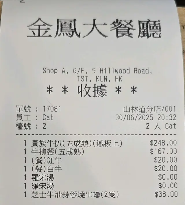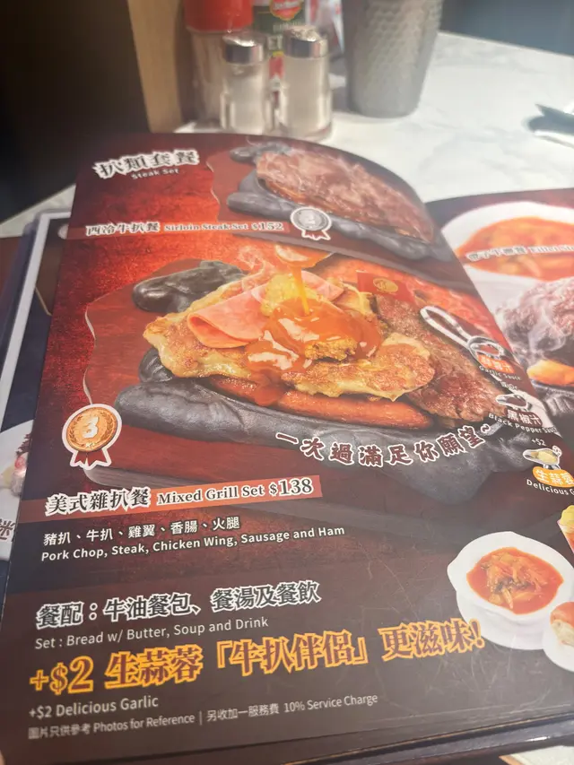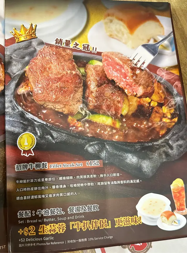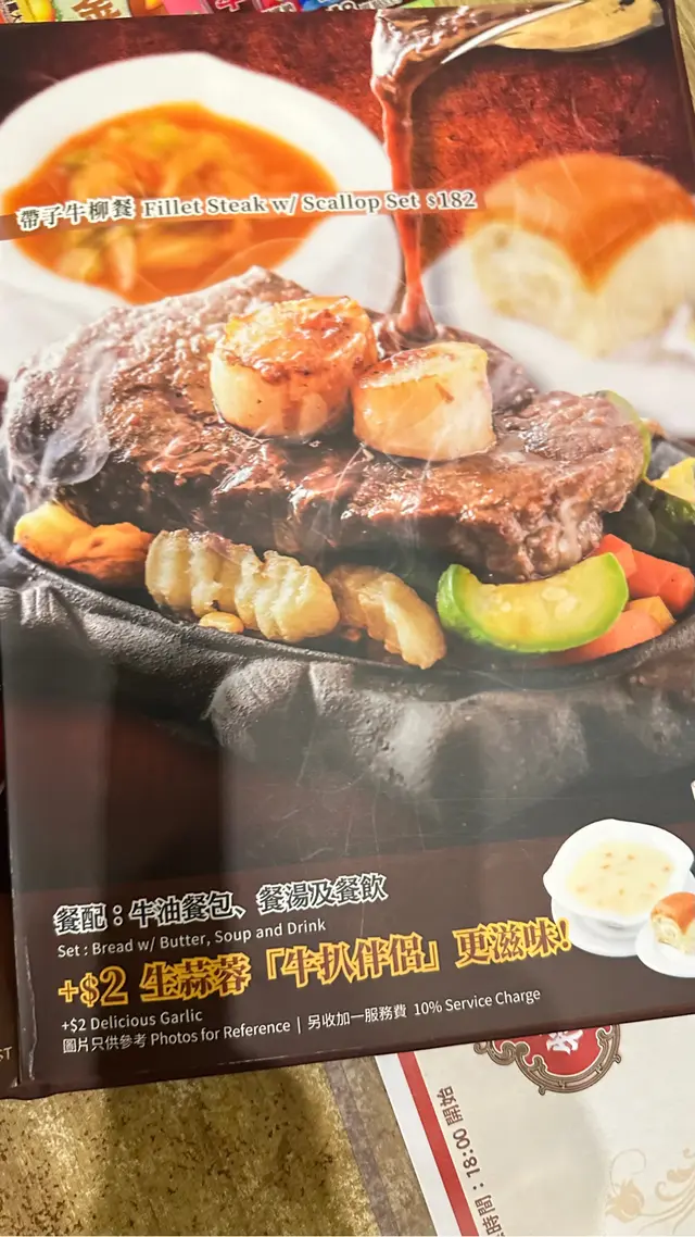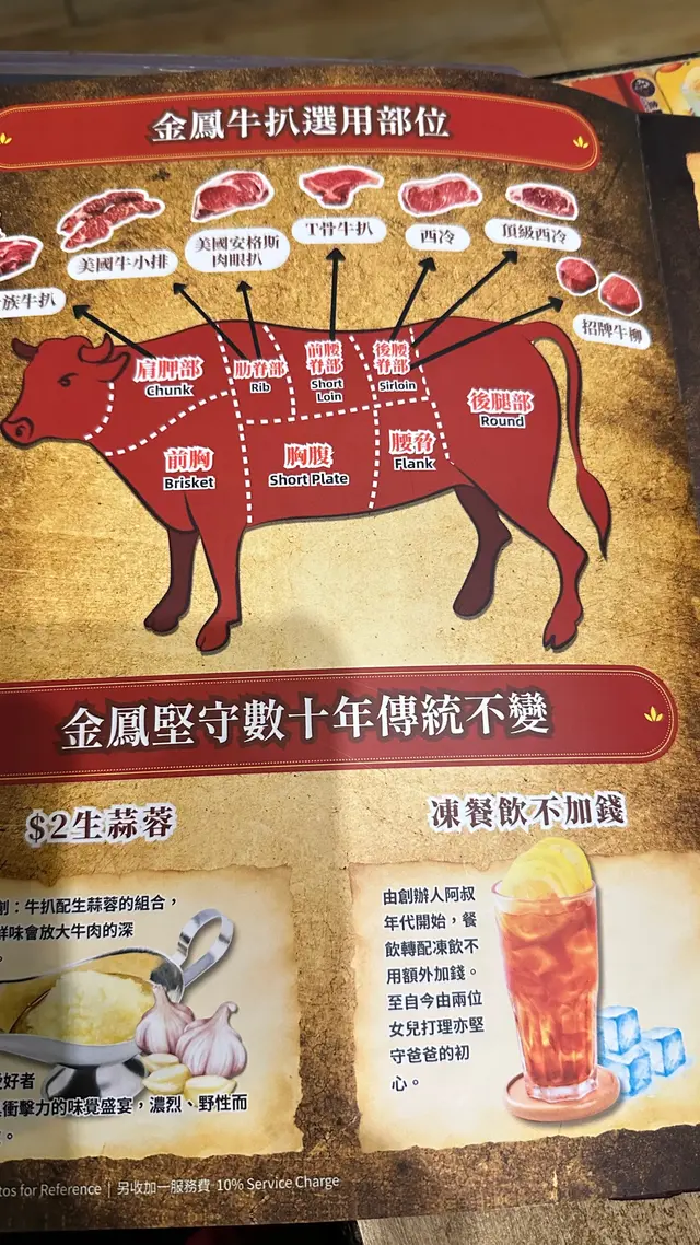記得小學時候,就已經在太子的金鳳餐廳食牛扒,當年是慶祝或者節日才會去鋸扒。而家成年,就不需要慶祝才會去食牛扒,今日來到山林道,見到金鳳餐廳,即時勾起童年回憶。一入去已經見到當年牛扒叔叔的威水史。餐牌還更新了,註明牛的各部份, 十分細緻。當然少不了有經典的牛柳扒,蘇格蘭扒,肉眼扒 等還有龍蝦牛柳餐 ,特選晚餐等。多了很多不同的小食,價錢也不貴。一直非常喜歡這間餐廳的羅宋湯,口味濃郁,還有很多不同的蔬菜。晚餐A-帶子西冷牛扒(五成熟) $190識食一定要加蒜茸 (+$2)西冷牛扒很多筋,肉質柔嫩,但牛肉味道很淡。帶子非常大粒,但有鹼水味。招牌牛柳餐(七成熟)$154牛柳很驚喜,肉質嫩滑,牛肉味道濃郁。晚餐:跟餐送了一個雪糕。感覺還是不錯的,雖然價錢和以前相差了很多倍,但牛扒的味道還是記憶中一樣,特別是黑椒汁,黑椒味道非常濃郁。但下次一定會選擇招牌牛柳餐或者蘇格蘭牛扒🥩…查看更多