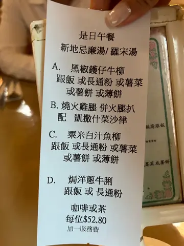 #20250213 🤍📍 #金鳳大餐廳 灣仔謝斐道415-421號地舖➖➖➖➖➖➖➖➖➖➖➖➖➖➖➖➖➖ 🥢 #餐包 💭 呢度每個lunch set都會跟個湯同包,食晏呢啲繁忙時間店員姐姐都唔理究竟叫左野食未,一坐低就放左個包先,可以一路食住一路諗下食乜,呢啲軟熟餐包幾時都咁好味🍞. 🥢 #餐湯 💭 白湯係屋企風味,雪櫃有咩就放落去果隻,今次有生菜火腿粟米,係好豐富既金寶湯🌽紅湯同樣好豐富咁有好多蔬菜係入面,樣樣都煲到好淋,加上啲茄膏既酸酸辣辣,係港式茶記既味道🥫.#黑椒鑊仔牛柳 #薄餅 $54.6💭平時叫呢啲扒通常都係飯、意粉或者薯菜,呢度有薄餅都好吸引🤩叫之前仲疑惑係印式既薄餅定pizza果隻薄餅🍕有兩大塊點黑椒汁又唔會唔夾,牛柳夠淋絕對係鬆肉粉既功效,唔使驚會咬唔到,而且都有啲牛味,係唔錯既~.#紅酒牛脷 #薯餅 $54.6💭 除左薄餅,佢仲有其他出面唔常見到既配菜,例如螺絲粉、薯餅、烚菜、黑醋沙律等等🥗試左薯餅,炸得香脆而且大塊,同紅酒洋蔥汁既牛脷一齊食真係飽到上心口🐮. 🥢 #熱檸茶 #熱朱古力 💭 Lunch set跟湯同包仲跟埋餐茶,普通熱野唔使加錢,好似加錢就有啲紅豆冰之類既特飲,見到呢度個餐定價都真係幾特別,因為佢地計埋加一就岩岩好$60,咁既價錢係灣仔算係好平喇👍🏼.#灣仔美食 #🐷在灣仔 #🐷_食 Read More