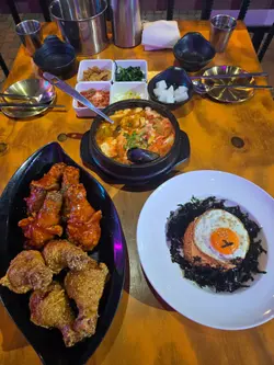 今次試咗兩款主打菜,抵食又驚喜! 首先係 「半半炸雞」,揀咗蜂蜜醬油同原味雙拼。雞皮炸到超鬆脆,入面雞肉竟然keep到嫩滑多汁,蜂蜜醬油香甜惹味,原味就更能食到肉香,真心抵讚! 「釜山豬肉湯飯」湯頭濃郁得嚟唔鹹,豬肉煮到軟淋入味,加埋韭菜、蝦醬調味,熱辣辣咁食落肚,暖胃又滿足。 最貼心係落單即送上「六色韓式小菜」泡菜爽脆、辣醬魷魚彈牙,甜薯微甜,每款口感都唔同,送飯送炸雞都夾,成餐飯豐富又唔膩口。 整體食物質素對得住價錢,尤其炸雞真係食過翻尋味,想簡簡單單食餐高質韓料的話,呢度值得一試!