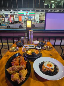 上個周末嚟到依間韓國餐廳食飯,店面好有特色,霓虹燈適合打卡。一坐低,店員就會提供三款前菜(泡菜、黑豆、魚糕),可以任添。今次嗌咗以下兩道菜:🔸原隻雞蔘雞湯:湯底清甜,湯比較濃淍,入面有啲細細粒飯粒。雞肉嫩滑,食完唔口渴,飽肚又暖胃。🔸泡菜煎餅:煎得金黃香脆,泡菜味冇想像中咁突出,味道剛好,食完一件又想食下一件。星期六夜晚去餐廳已經有啲full,店員提議我同朋友坐出面,但冇提及出面可以食煙;以致我哋食咗冇耐之後,隔離有枱食客食煙,我哋要吸二手煙。食物好食,不過覺得服務還有改善空間,而且價錢比較進取,可能以遊客生意為主。