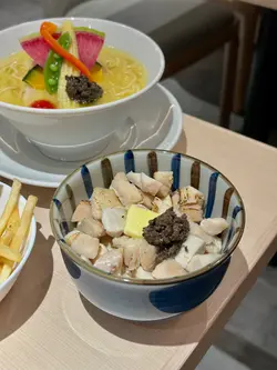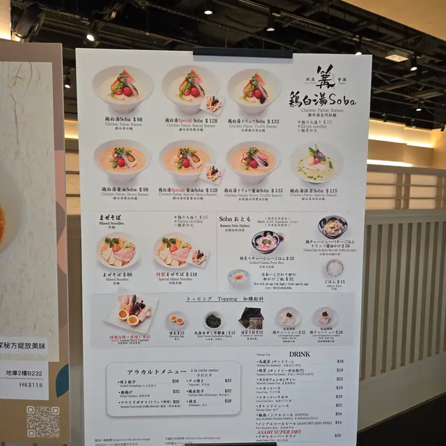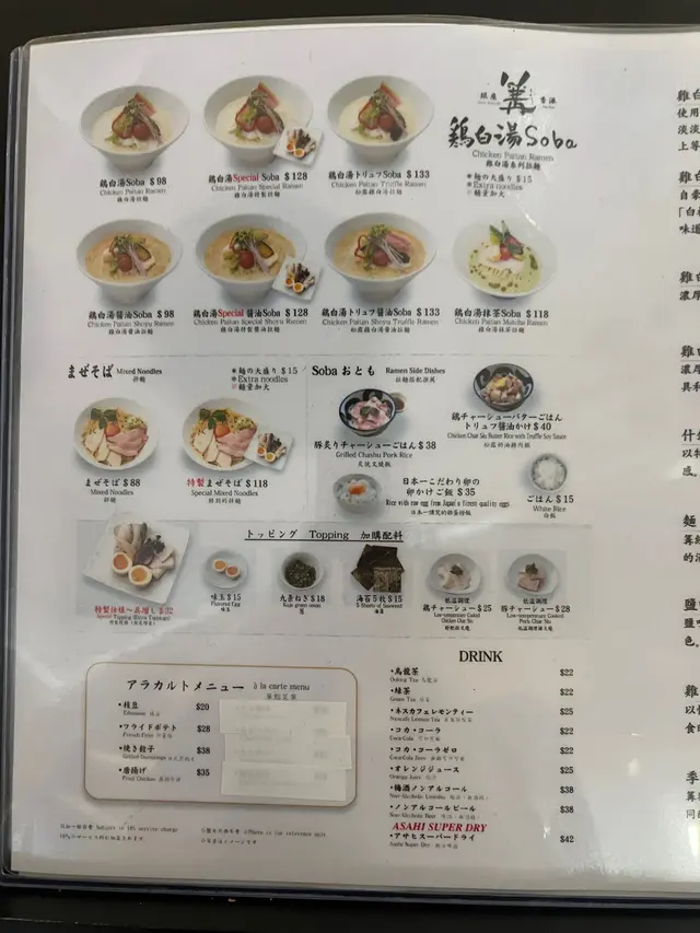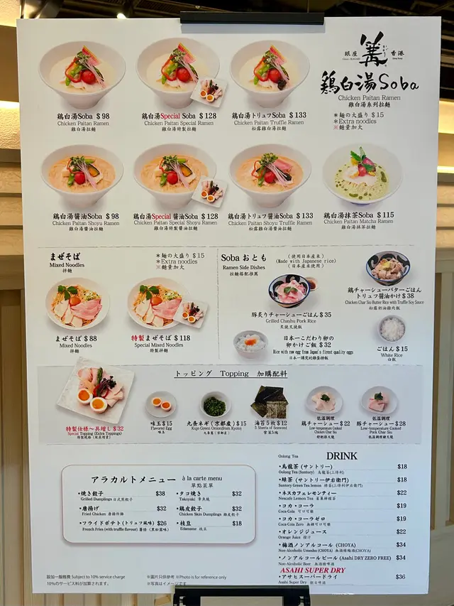 雞白湯特製拉麵湯底:雞湯味濃郁。相對於坊間有d 比較奶味嘅湯底,呢個嘅雞味相對重一啲,似係傳統雞湯但呈現杰身濃稠嘅質地。另外佢多咗一層油喺面,令到味道再濃郁一點,如果怕油嘅朋友就可能有啲介意。麵條:正常日本生麵嘅味道,份量頗多。食到最後都冇咩鹼水味係個湯到。材料:特製套餐比起普通餐多左一碟配菜。有兩片雞肉,一件比較嫩滑,一件正常水準。唔鞋口但又未去到好嫩滑好驚喜嘅地步。🤔松露雞白湯醬油拉麵湯底 : 松露味係非常充足,濃郁到完全遮蓋左雞白湯嗰種鮮甜嘅雞味,淨係飲到好似忌廉黑松露汁咁樣。我原本以為係雞湯味為主,再帶少少松露增添多一點層次,但係而家松露嘅味道完全over power咗。本身個味道唔差,但就冇雞湯味。除非一心只係想食到松露湯底味,否則唔推介。🤔雞白湯抹茶Soba湯底 : 第一次見有抹茶味嘅湯底,好奇心起點來試下。其實味道唔伏嘅,帶有淡淡嘅抹茶甘香,居然成件事係夾到。不過如同上述,抹茶嘅甘香味遮蓋左雞湯果種鮮甜味。自己試一次就好,比較上來都係原味嘅雞白湯最鮮甜最推介。餃子:正常日式餃子嘅味道。…查看更多