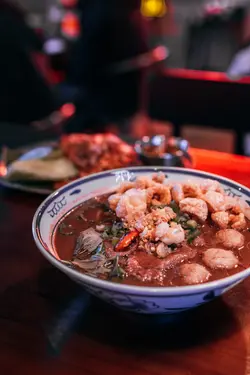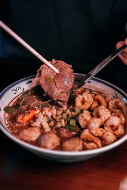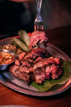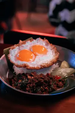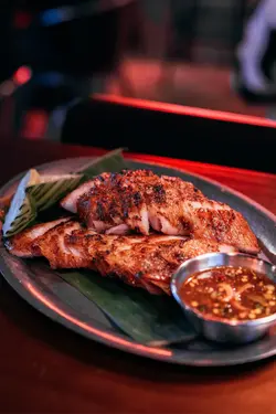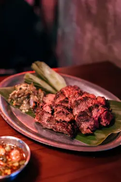 行入九龍城龍崗道,平時預咗係嗰種地道得黎又有啲 ᴄʜᴀᴏᴛɪᴄ 嘅大排檔 ꜰᴇᴇʟ,但呢間舖頭完全係另一個維度。水泥工業風嘅設計,配搭返少量泰式元素,成間舖係五光十色嘅霓虹燈,成個 ᴠɪʙᴇ 係 ᴄʜɪʟʟ 嘅。.主廚係泰國土生土長,店名取自曼谷嘅潮流小區 ᴛʜᴏɴɢ ʟᴏ,概念好清晰,就係將泰國街頭味道用 ʜɪɢʜ-ᴇɴᴅ 嘅食材重新演繹。主廚明顯喺食材選購上面花咗心思,尤其係牛肉嘅質素,唔係一般街邊檔貨色。主打嘅船麵湯底亦係誠意之作,唔係單靠味精堆砌,而係真正熬出黎嘅濃厚度。.必叫嘅船麵(船牛),湯底深褐色,濃稠度極高,入口有一種好複雜嘅藥材香同牛骨味,帶少少回甘,掛麵能力一流,牛肉片即使浸喺熱湯都保持到嫩滑。另外個香辣金不換炒和牛飯,打拋牛鑊氣幾足,上面加咗兩隻煎都好香嘅蛋,勁吸引。食落幾辣非常惹味。.串燒方面亦見功架,燒豬頸肉邊位燒到微微焦脆,肉質爽口彈牙,個 ᴅɪᴘᴘɪɴɢ ꜱᴀᴜᴄᴇ 酸辣度平衡得幾好。燒和牛就更加直接,油脂分佈靚,簡單燒一燒已經逼出油香,入口即溶嘅口感令人幾滿意。.甜品除咗標準嘅芒果糯米飯,椰漿鹹甜適中之外,個泰式奶茶焦糖燉蛋有驚喜。面層焦糖燒得薄脆,下面個燉蛋質地好似ᴄʀᴇᴀᴍ咁充滿泰式奶茶嘅茶香,甜度比預期中低。..ᴅɪɴɴᴇʀ✿ 船麵(船牛) 💲98✿ 香辣金不換炒和牛飯 💲108✿ 燒豬頸肉 💲88✿ 燒和牛 💲188✿ 芒果糯米飯 💲68✿ 泰式奶茶焦糖燉蛋…查看更多