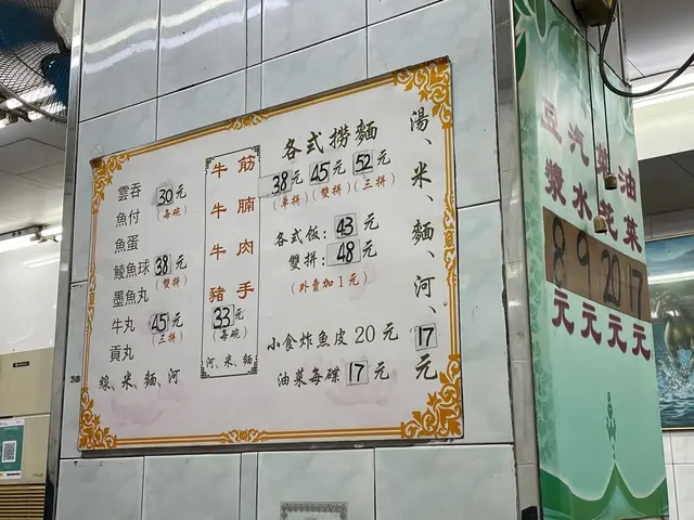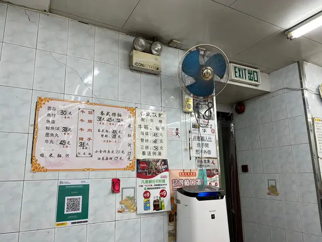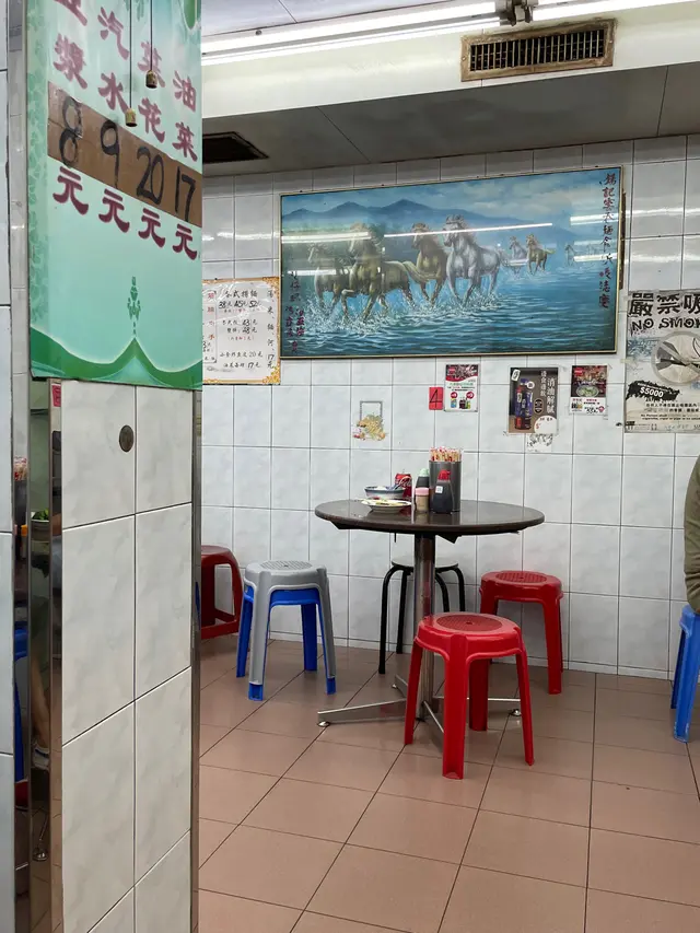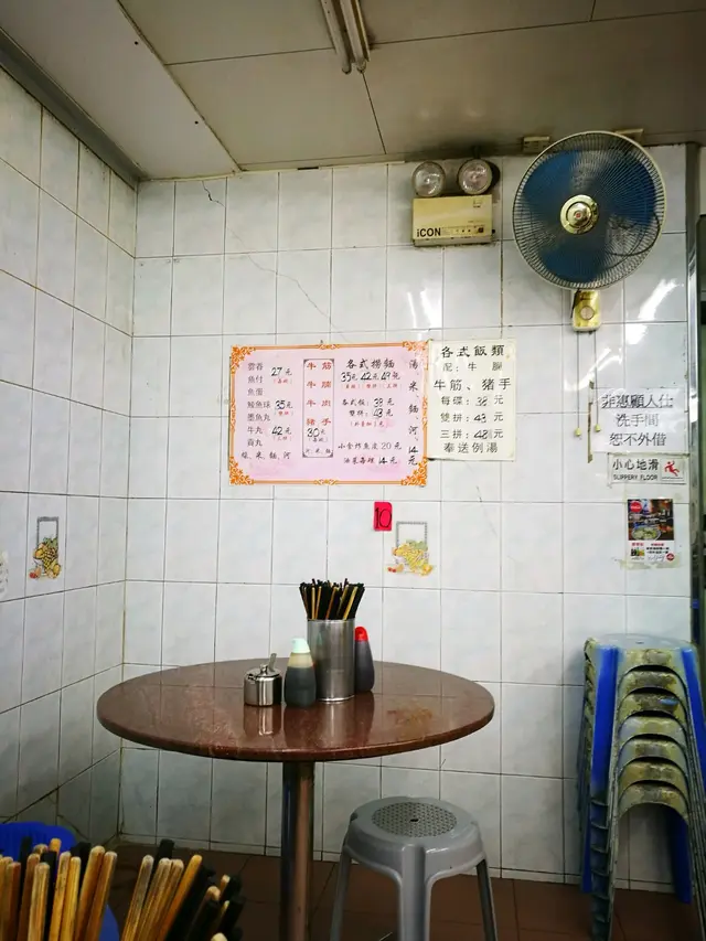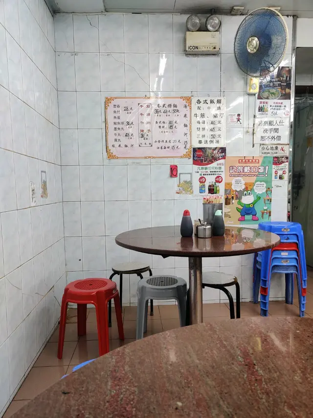 店內只有一張張圓枱,一張張藍/紅色圓膠櫈,一張張簡單而清晰嘅餐牌貼在牆上。圓枱置中位置放上有豉油,醋,辣椒油,筷子筒,牙籤。
