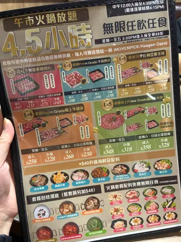 呢日難得有颱風假期,就搵間火鍋放題食吓啦,嚟咗旺角呢間火鍋放題 。午市可以食4.5小時,最平只需每位$163,我同友人就揀咗中價嘅Level 3嘅西班牙伊比亞黑毛豬套餐,再額外加$40追加海鮮🤤鴛鴦鍋底♦️養生椰子雞涮涮鍋食落去有淡淡嘅椰子香味,用嚟淥蔬菜一流🥥♦️藥膳沙茶牛肉涮涮鍋味道好濃郁,食落口都幾惹味。肉類雖然呢個套餐只有三種肉類,但係肉質質素都唔錯,嗌呢個餐幾高性價比☺️♦️Prime Grade 美國安格斯牛肩胛肉帶有少少雪花,食落口唔會太肥膩,牛肉味道幾香🐮♦️西班牙伊比利亞黑毛豬係套餐嘅其中一款豬肉,黑毛豬嘅肉質幾爽彈🐷♦️西班牙無激素豬肉片呢個豬肉片比較薄身,都食得出質素有返咁上下標準🙊海鮮加$40就連精選海鮮都係任食,呢個價錢都幾抵 。如果唔加錢,本身套餐都包咗脆骨腩、鯇魚腩、白鱔等嘅海鮮🐟♦️白鱔片♦️帆立貝♦️墨魚仔♦️游水海蝦♦️花膠片♦️沙白蜆呢度有超過60款嘅火鍋配料任食,配料同其他出面嘅火鍋放題唔同,係需要落單,而唔係自助吧度夾,感覺比較衛生 。飲品同醬料就係喺自助吧自取嘅,最尾仲有一人一杯Haägen Dazs或者Mövenpick雪糕,為呢餐畫上完美嘅句號😋…查看更多
