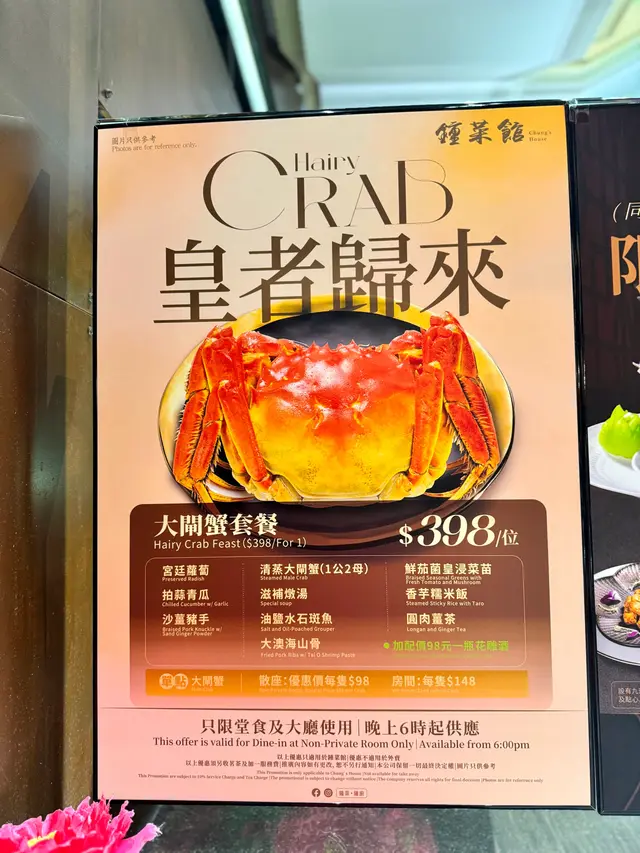 圓肉香甜,姜茶暖胃,完美結尾,在飽食之後感受到溫暖滋味。加配優惠此外,單點大閘蟹只需98/隻,仲可以選擇花雕酒,只需98/瓶,食蟹必飲絕配🍶總結🎈每晚6:00起供應,堂食限定,快啲約埋朋友一齊嚟蟹逅秋天,享受呢個美味大閘蟹套餐🎉…Read More